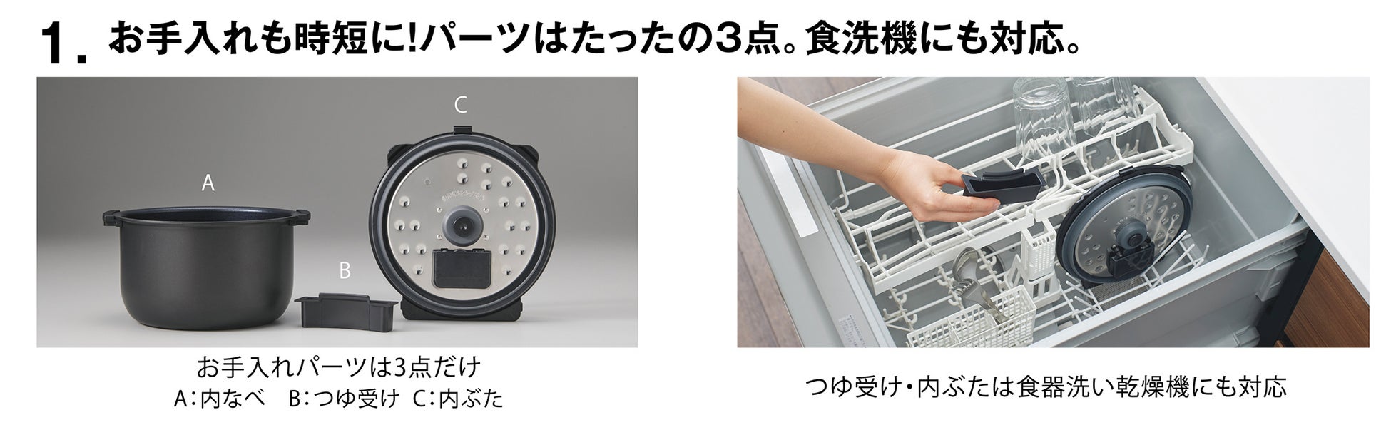 ほかにも、炊飯器調理の経験を活かしたレシピの豊富さやお手入れ性、電気ケトルなどの調理家電製品から学んだ直感的で分かりやすい操作性も追求いたしました。100年の技術を詰め込んだ100周年記念モデルです。