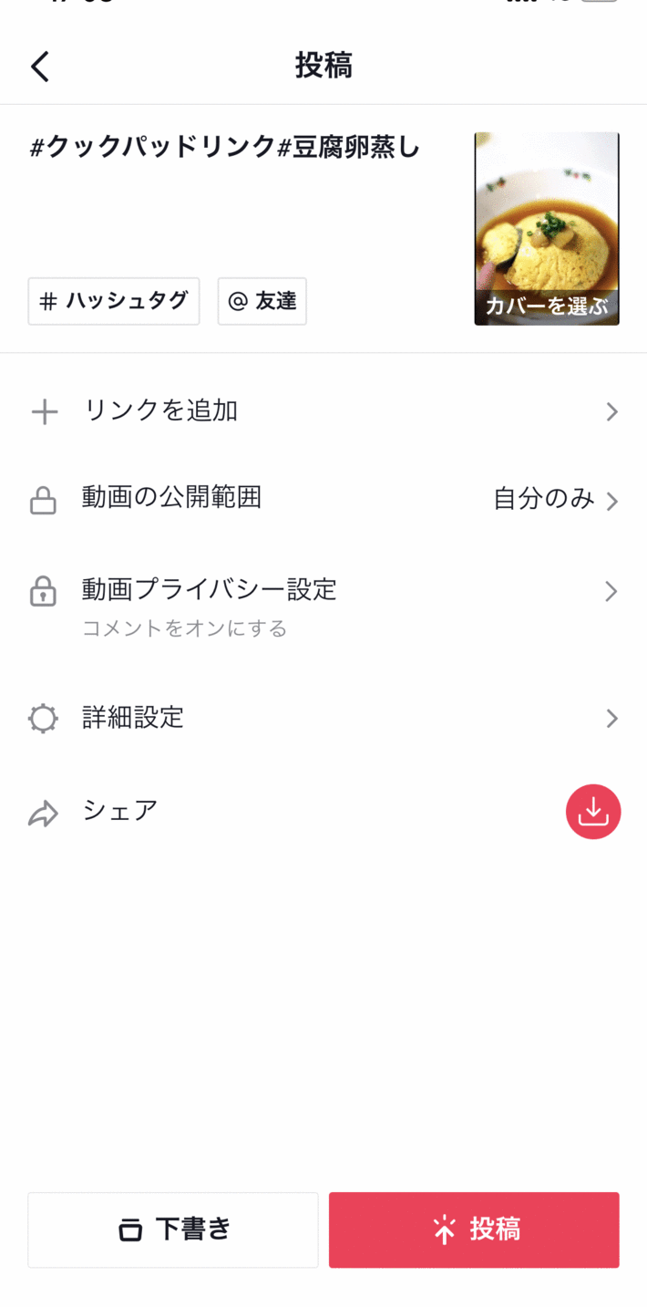 - TikTokにて料理動画の撮影(またはアップロード)と編集を完了し、「投稿前設定画面」に移動する
