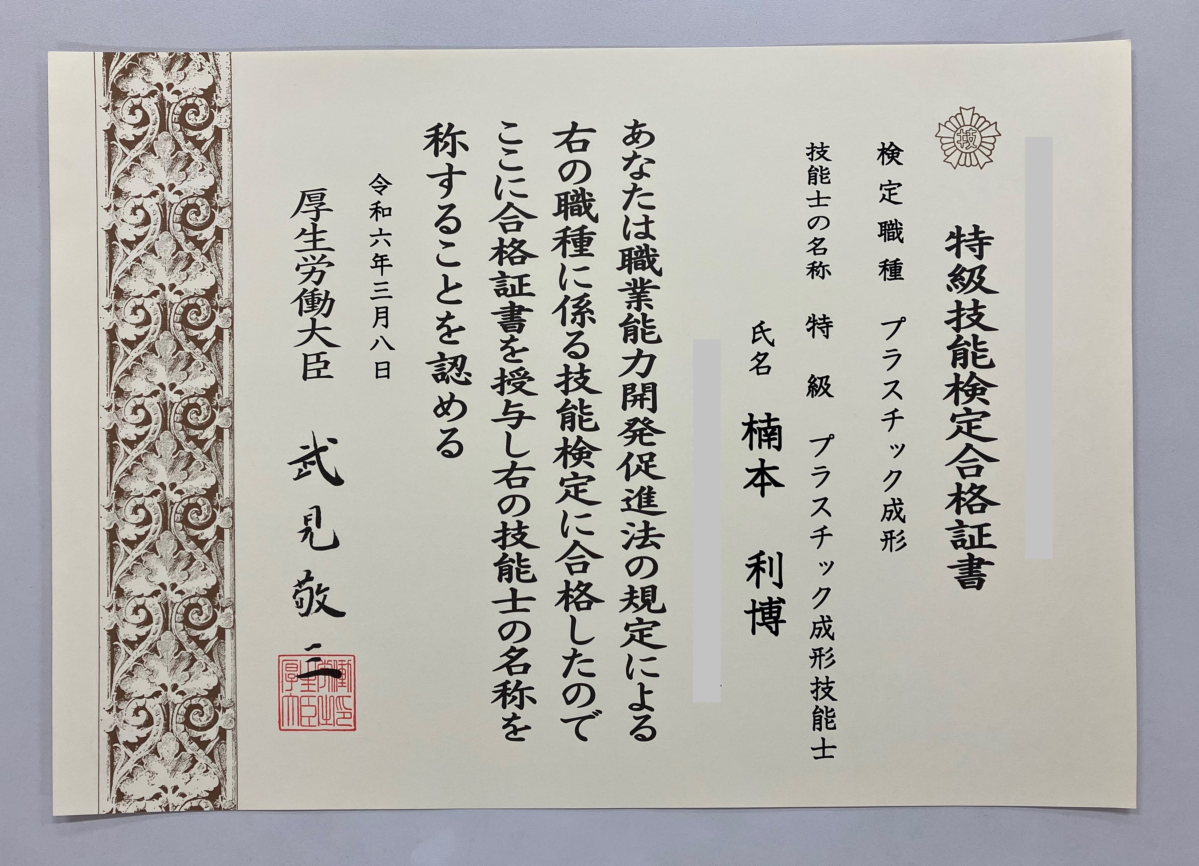 「特級プラスチック成形技能士」は、管理者として持つべき工程管理・作業管理・品質管理・原価管理・安全衛生管理、作業指導や設備管理の幅広い知識が求められます。今回資格取得した楠本は、長い年月を経て、「特級プラスチック成形技能士」合格に至りました。