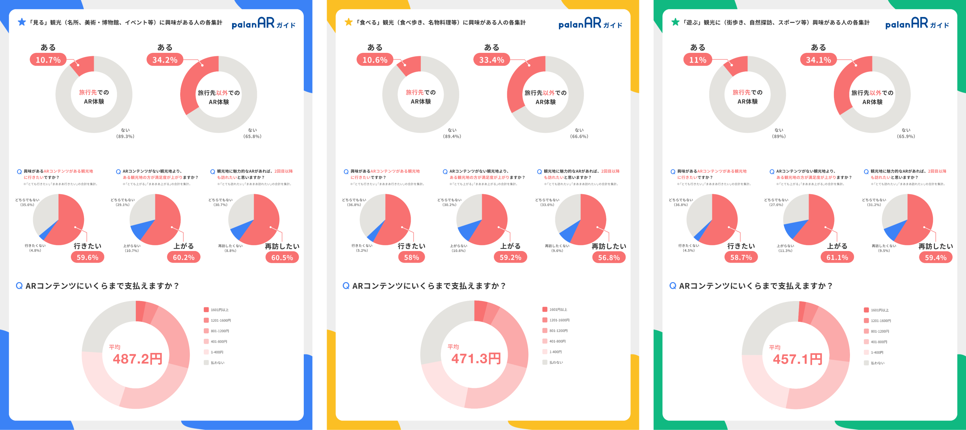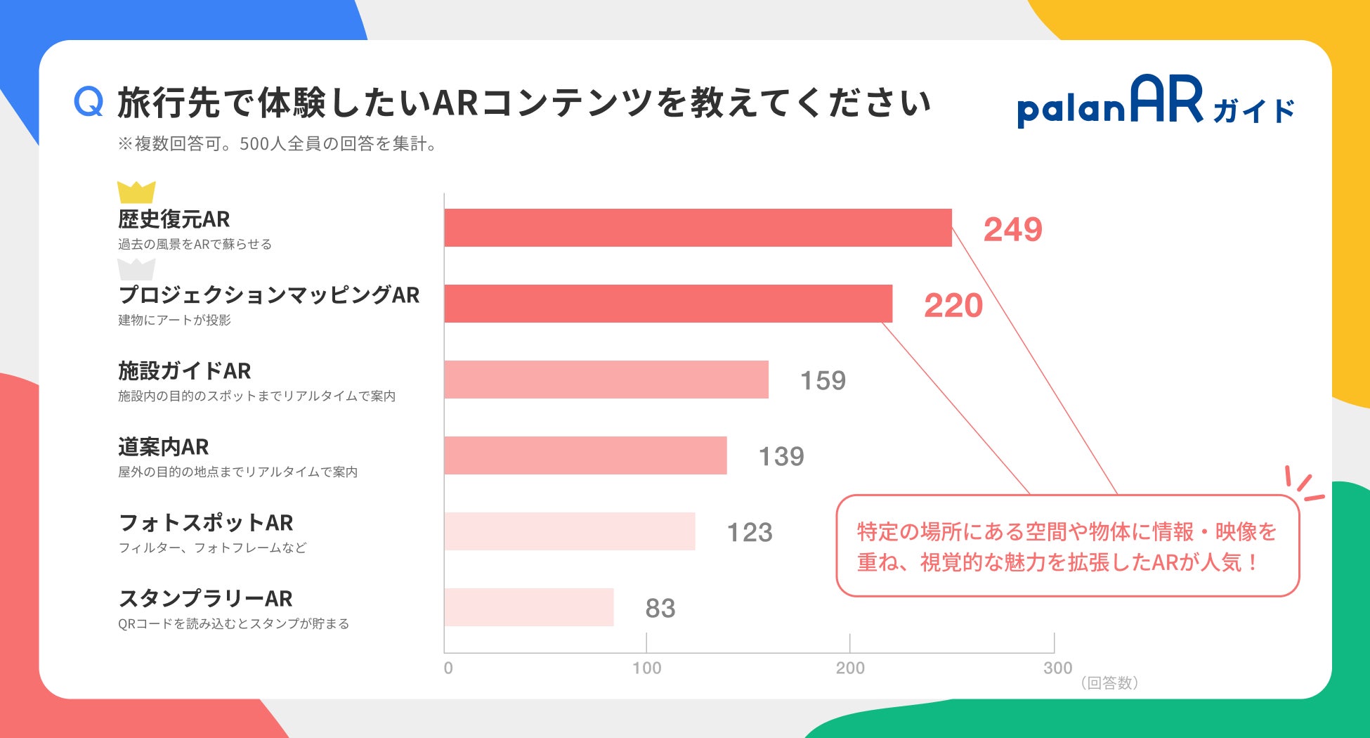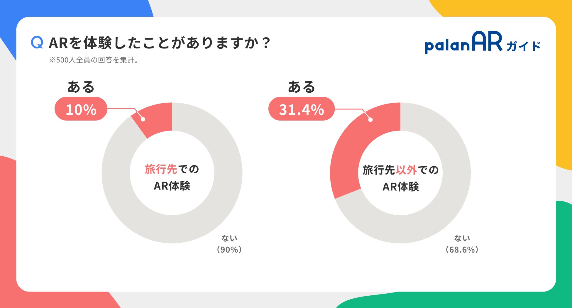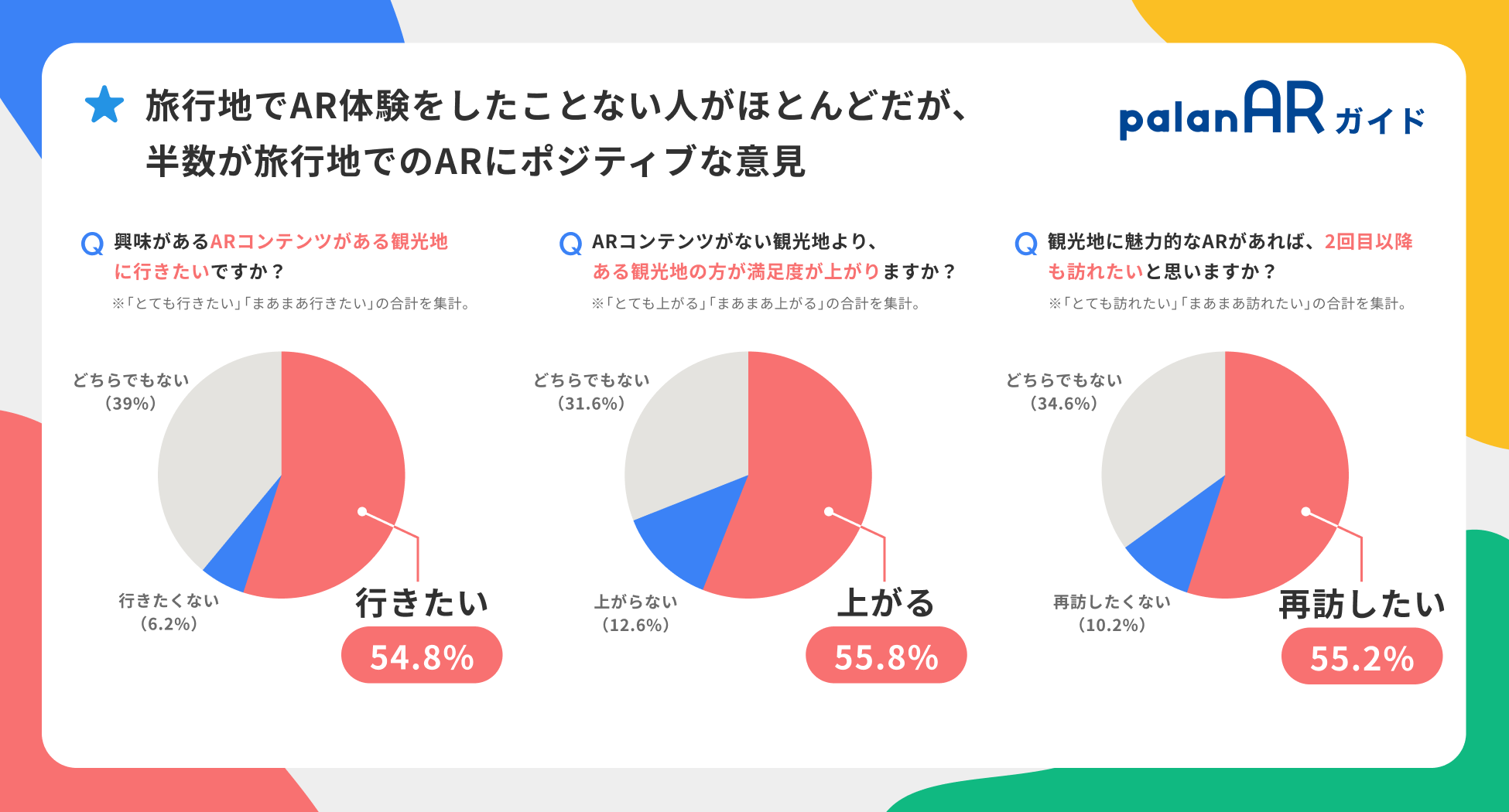 palanが行ったアンケート調査では、旅行先で体験できるARに対して「ARがある観光地に行きたい」「ARがある観光地の方が満足度が上がる」などポジティブな回答する人が各質問で50%以上と半数を占める結果に。過去に旅行先でAR体験をしたことがある人は10%と少ないながら、Apple Vision Pro の発表もあり、多くの人がARに対して期待を寄せていることが分かりました。
