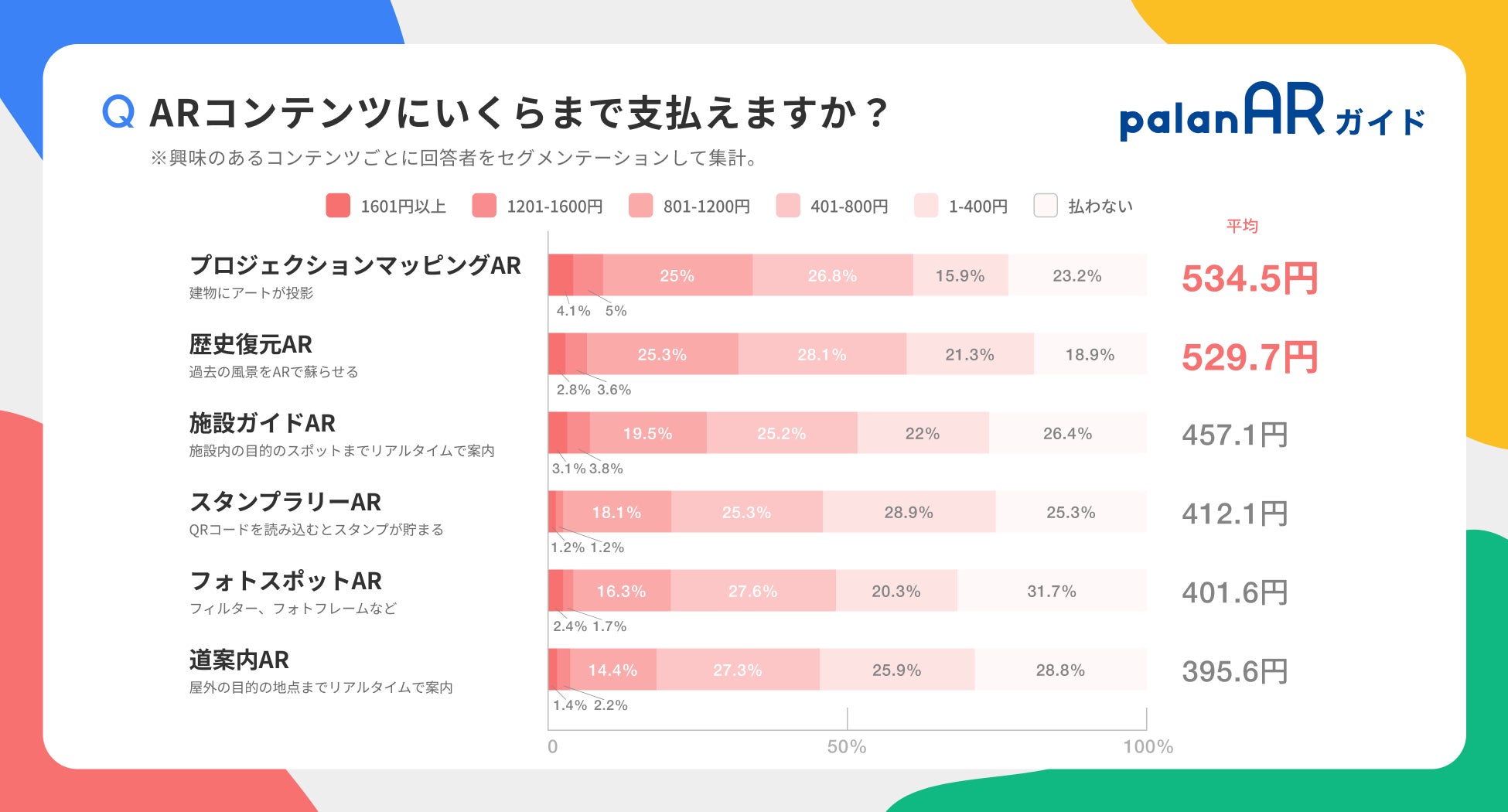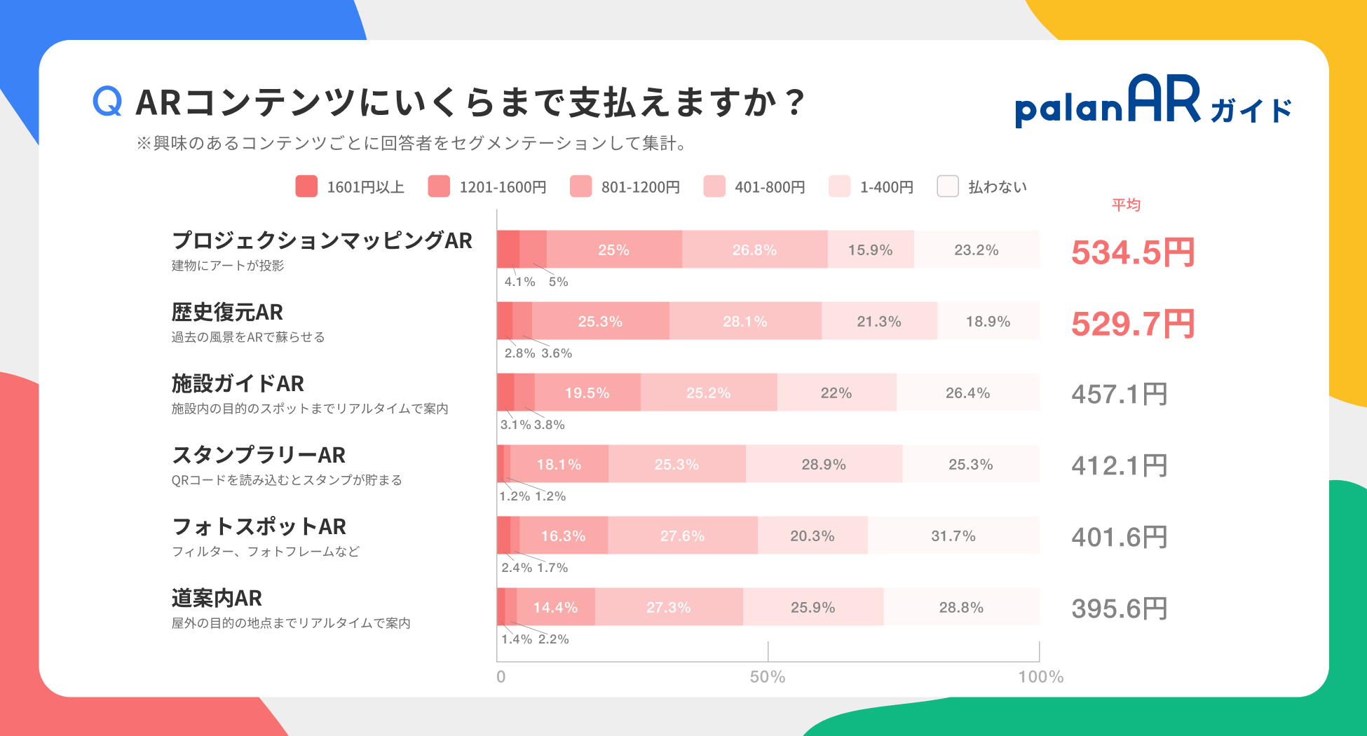 次に、興味のあるARコンテンツごとに回答者をセグメンテーションし、ARコンテンツにどれだけ支払えるかを集計しました。旅行先で体験したいARコンテンツとして人気だった「プロジェクションマッピングAR」や「歴史復元AR」が平均価格約530円と、他のARに比べて高い料金を支払えるほど価値を感じている人が多いことが分かりました。全体で見ても、ほとんどのコンテンツで70%以上の人が「ARコンテンツに料金を支払っても体験したい」と考えていることが分かりました。