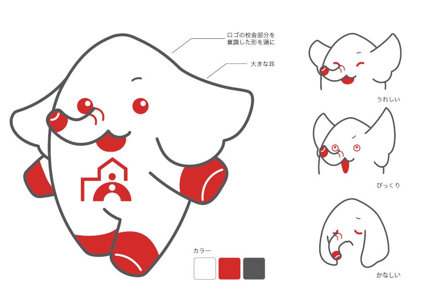 反対側の耳は三角定規をイメージした形にすることで、愛らしい着ぐるみ的なフォルムの中に映える個性的なデザインにしています。笑った表情で目がロゴマークに似た形になるところもお気に入りのポイントです。