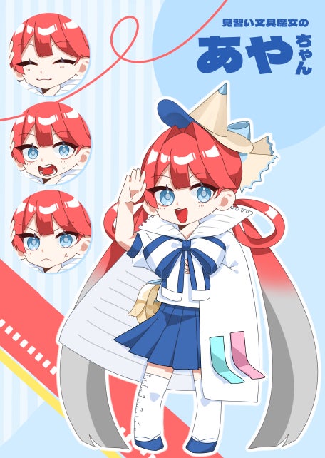 帽子は鉛筆、帽子のリボンは鉛筆の削りカス、髪の毛はハサミ、マントはメモ帳、マントについた付箋、胸元のリボンは消しゴム、腰元にテープ、靴下は定規 といった風に文房具の要素をたくさん詰め込みつつ、学生向けのキャラクターということで制服っぽく見えるようにしています。