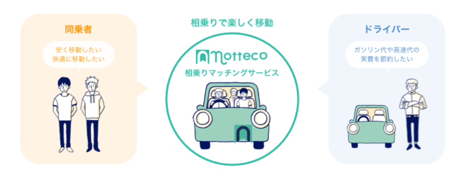 また運営する「notteco」は、「いつもの移動を、もっと楽しく」をコンセプトにした中長距離のカープール型ライドシェアサービスです。nottecoには「地域の足を地域で守る」というシェアリングエコノミーの考え方があります。ドライバーに報酬が発生せず、目的地を同じとする「安く移動したい利用者」と「ガソリン代などの実費を節約したいドライバー」をマッチングさせ相乗りできるサービスです(※2)。