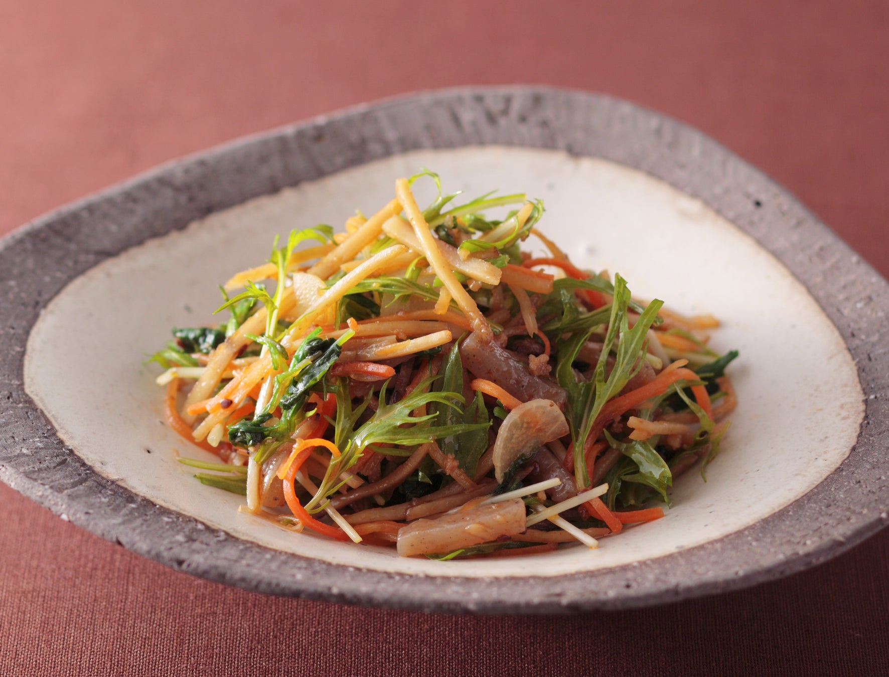 和の定番おかずのきんぴらに、七草や水菜を合わせて和さらだに。醤油ベースの味わいに、ごま油、コチュジャンを効かせているので、おかずとしてもおつまみとしてもおすすめです。
