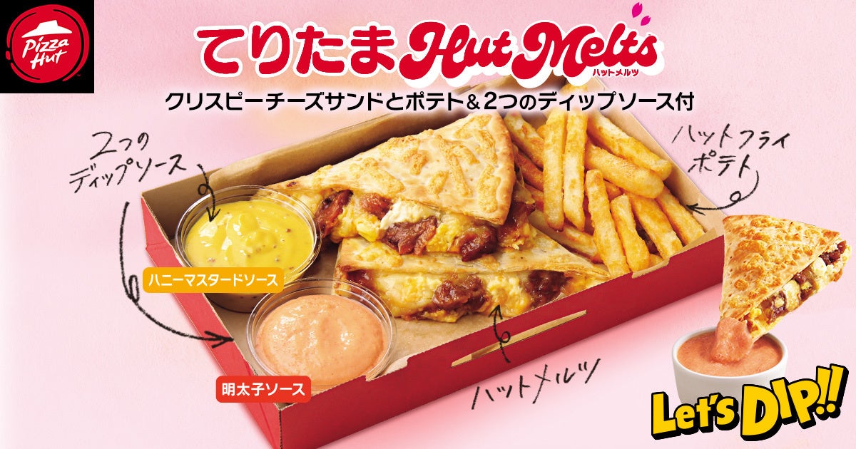 てりたまファン待望!ついに、ピザハットに「てりたま Hut Melts」が新登場しました!「てりたまHut Melts」は、大人気商品である「Hut Melts」を春仕様にアレンジ。サクッと食感のクリスピータイプの生地の中にとろけるチーズとコクのあるたまご、相性抜群のてりやきチキンをたっぷり閉じ込めた、春にぴったりな“おひとりさまピザ”です。ディップソースは、春色のあざやかなピンクと黄色が季節を感じられる明太子ソースとハニーマスタードソースの2種となっております。