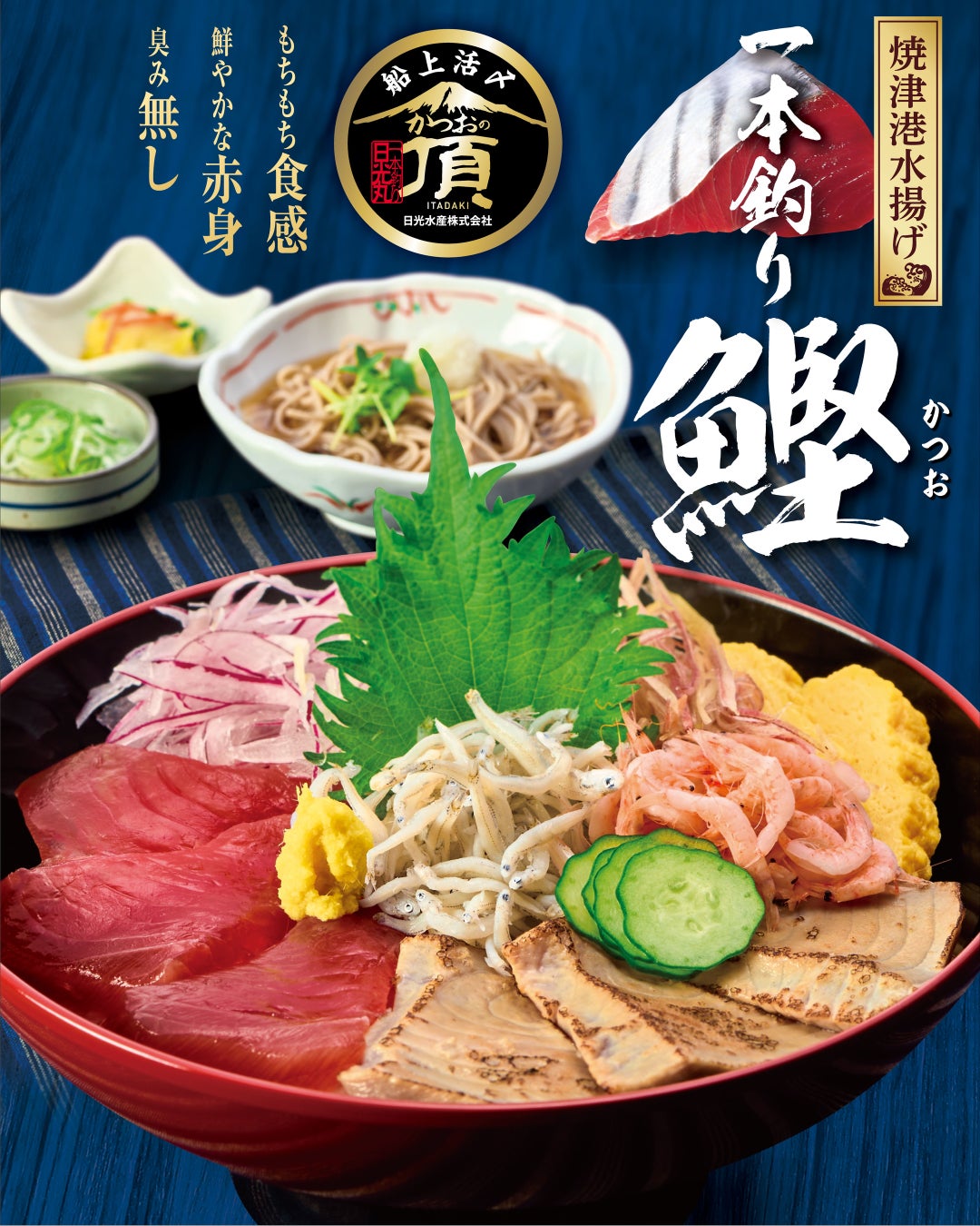 一本釣り鰹を「刺身」と「炙り」の二種に加え、釜揚げ桜海老としらすを贅沢に丼