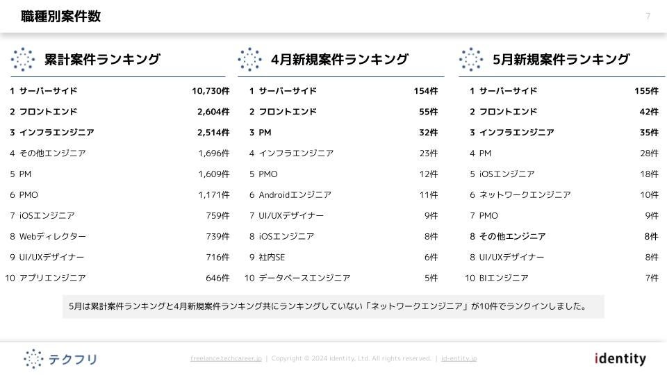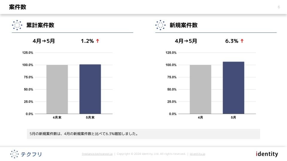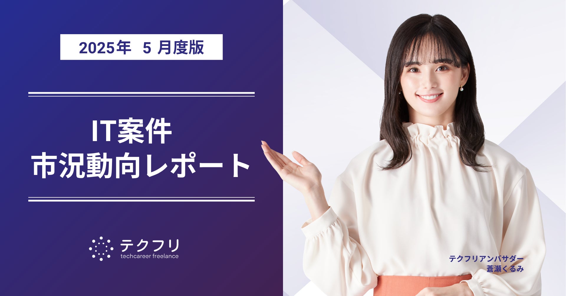 ITフリーランスエンジニアの案件・求人サイト「テクフリ」(https://freelance.techcareer.jp/)を運営する株式会社アイデンティティー(東京都新宿区、代表取締役:今野 力、以下「当社」)は、テクフリのデータベースをもとに2025年5月における案件の市況感を調査しました。より詳しい結果については、お問い合わせから資料請求が可能です。