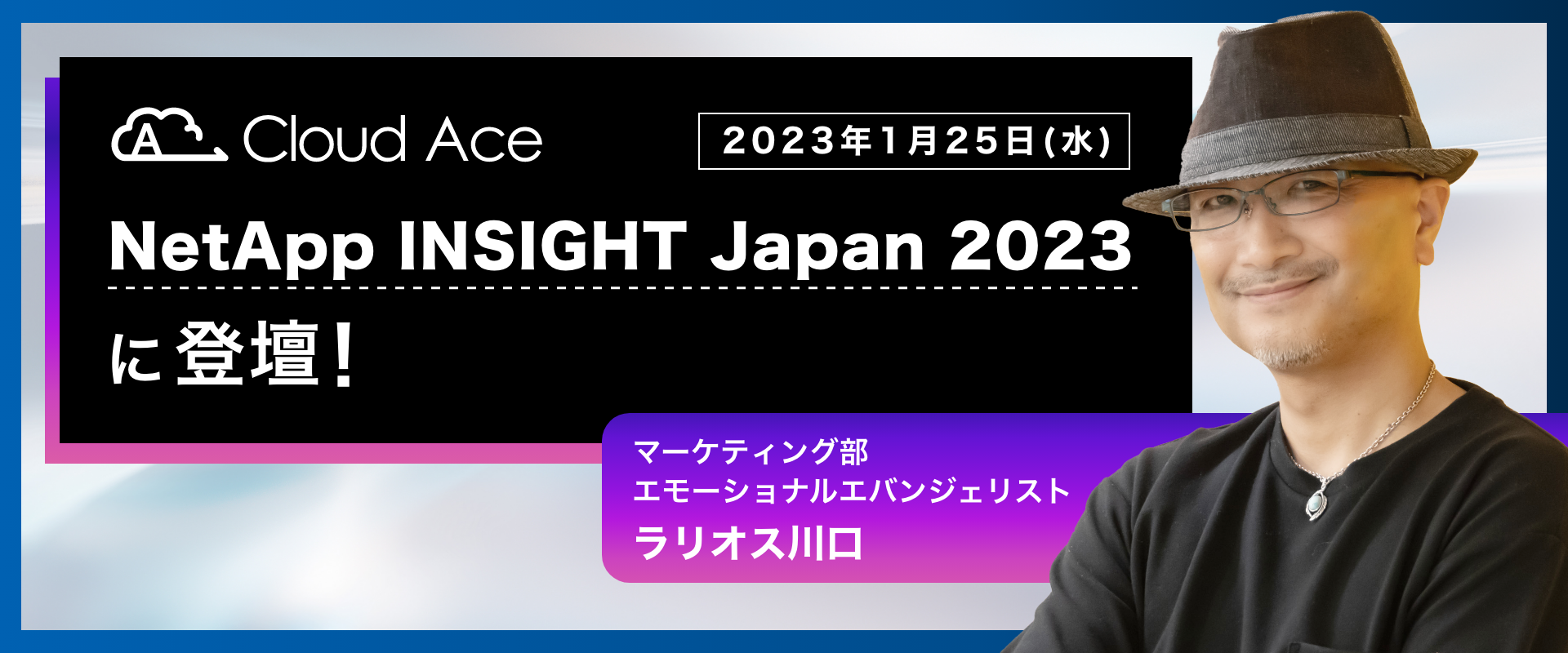 クラウドエース株式会社(本社:東京都千代田区、代表取締役社長:青木 誠/以下クラウドエース)は、2023 年 1 月 25 日(水)にネットアップ合同会社(本社:東京都中央区、代表執行役員社長:中島シハブ) が主催する「NetApp INSIGHT Japan 2023」に、弊社のラリオス川口が登壇することをお知らせいたします。