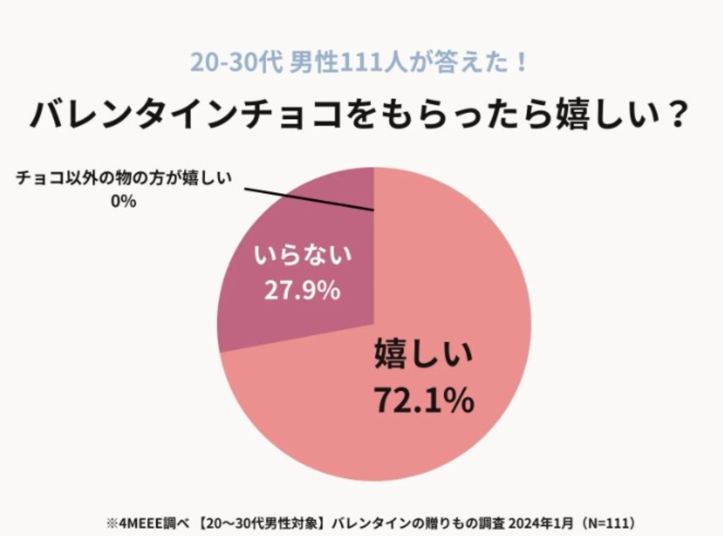 『4MEEE』掲載記事では、20~30代の男性111人に対し、もらって嬉しいバレンタインの贈り物や、市販チョコと手作りチョコで嬉しいのはどちらかなど、バレンタインの疑問を徹底調査しました。「バレンタインチョコはいらない」という男性が3割いることが明らかに!
