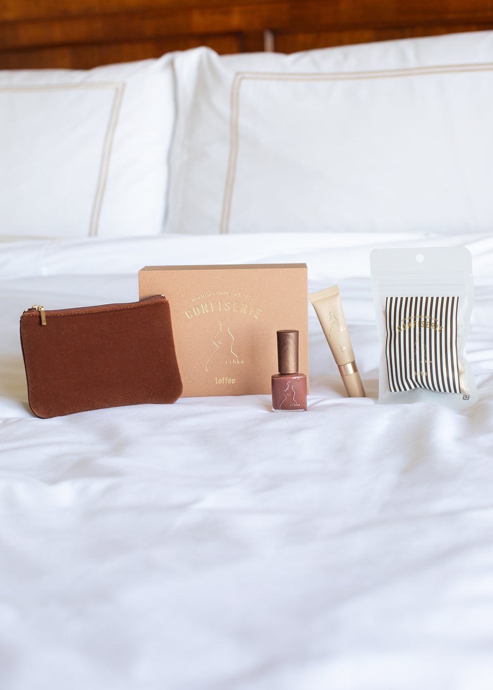 濃厚なカフェオレ味のトフィーをイメージしたリップグロス、ネイルポリッシュ、やわらかな手触りと高級感のある素材のベロア生地を使用した、持ち歩きにぴったりなサイズのペティートポーチ、カフェオレ味のキャンディをコスメ収納ボックスに詰め合わせた、ホリデー限定のcandy boxコフレ。リップグロスとネイルポリッシュはいずれも現品サイズです。