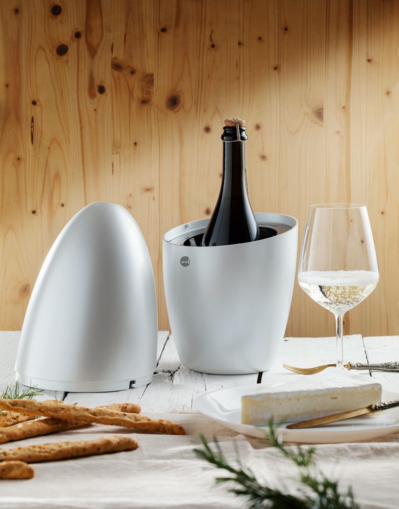 シンプルで洗練されたデザインで、高い機能性を備えるワインセラー「WEGG」を展示。WEGGは独自開発された冷却ジェルをセットするだけで簡単にワインやシャンパンを冷やすことができます。