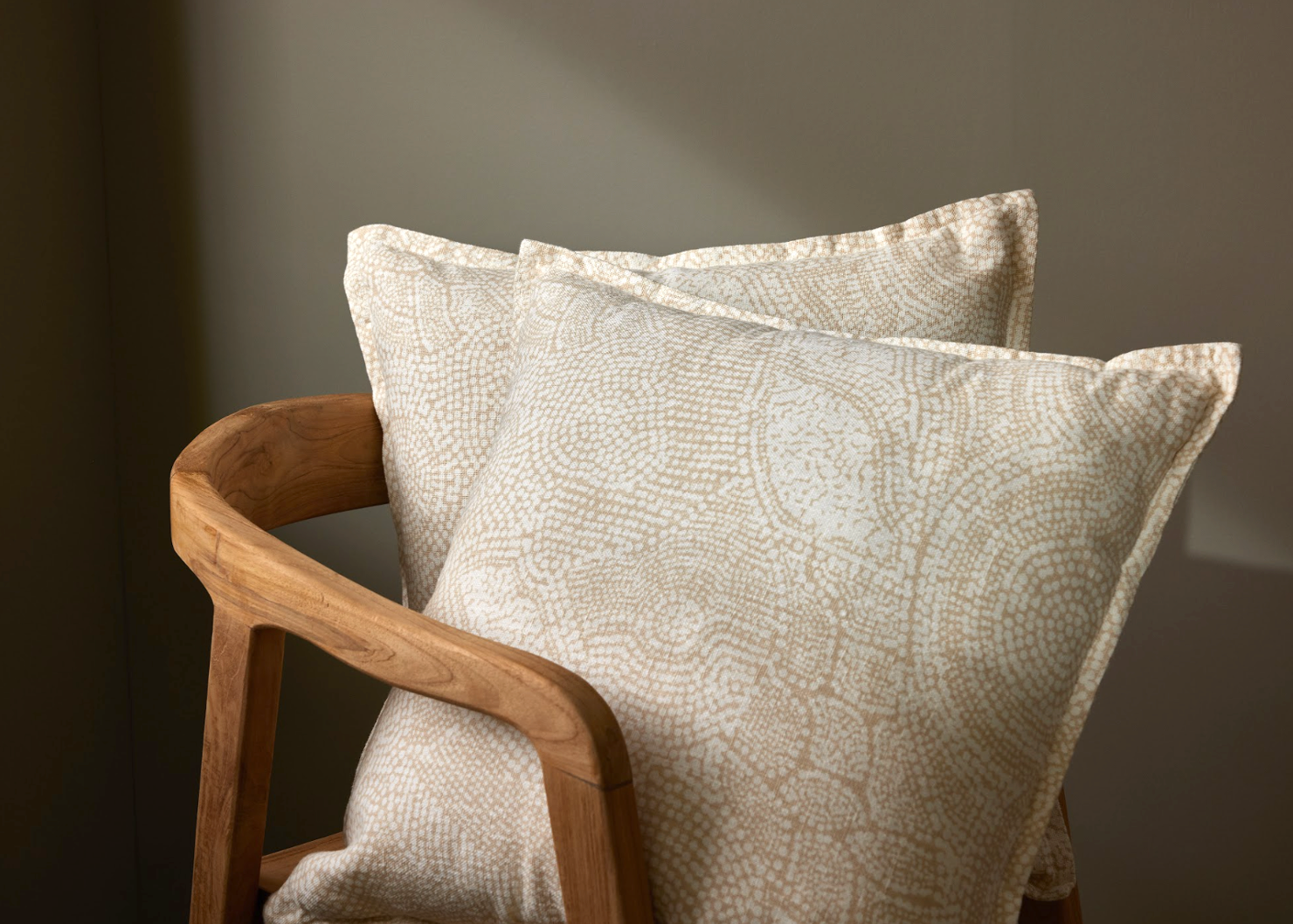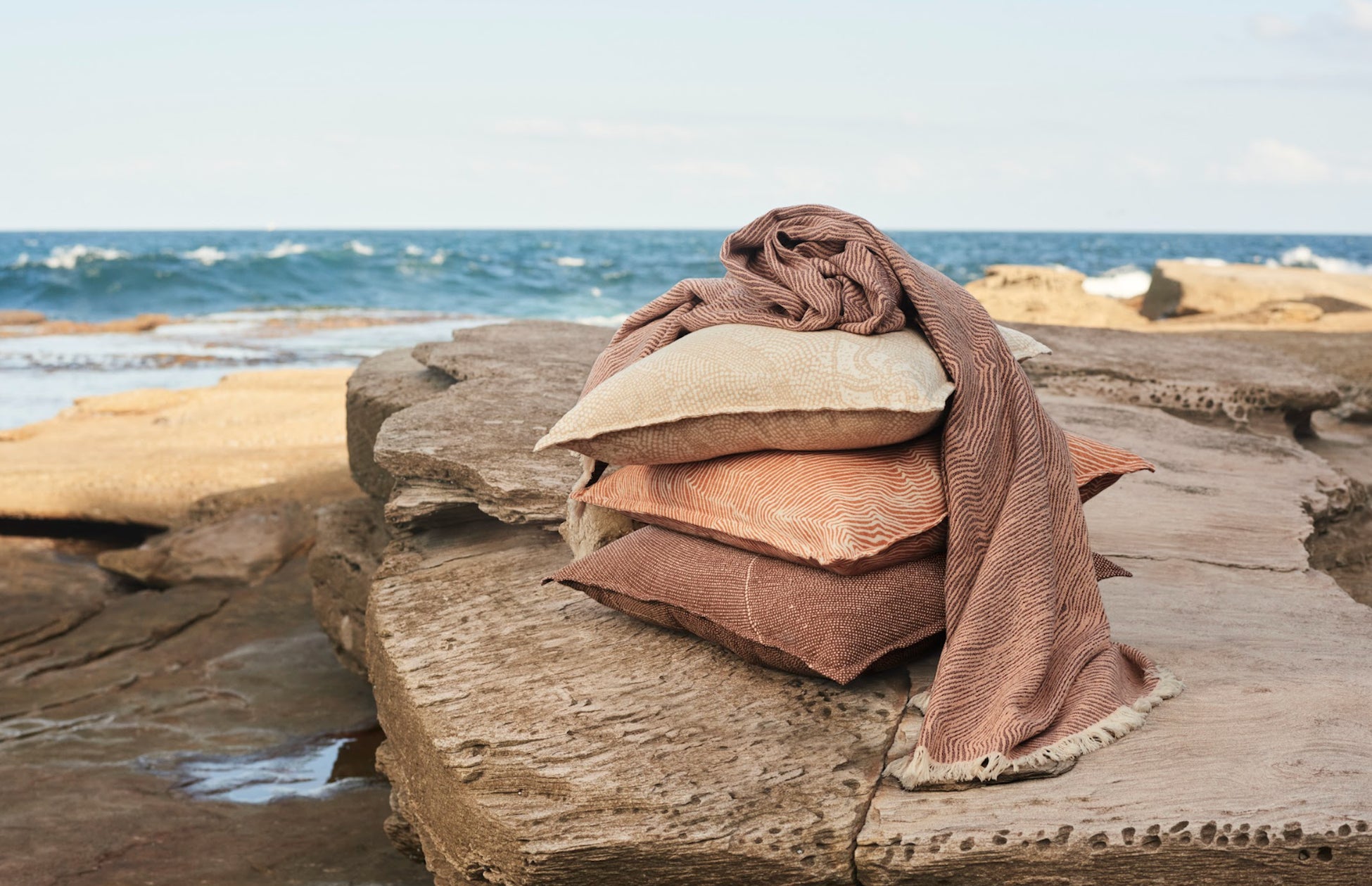 「グプドリーミングクッションカバー」(写真左)は、アボリジニの言葉で「水」を意味する「Gupu(グプ)」にちなみ、水の流れと躍動感、そして生命を育む力強い存在感を表現。他にも、雨などの自然から着想を得たクッションカバーやスロー・ブランケット(写真上)など、落ち着いたアースカラーのホームウェアを4アイテムで展開します。