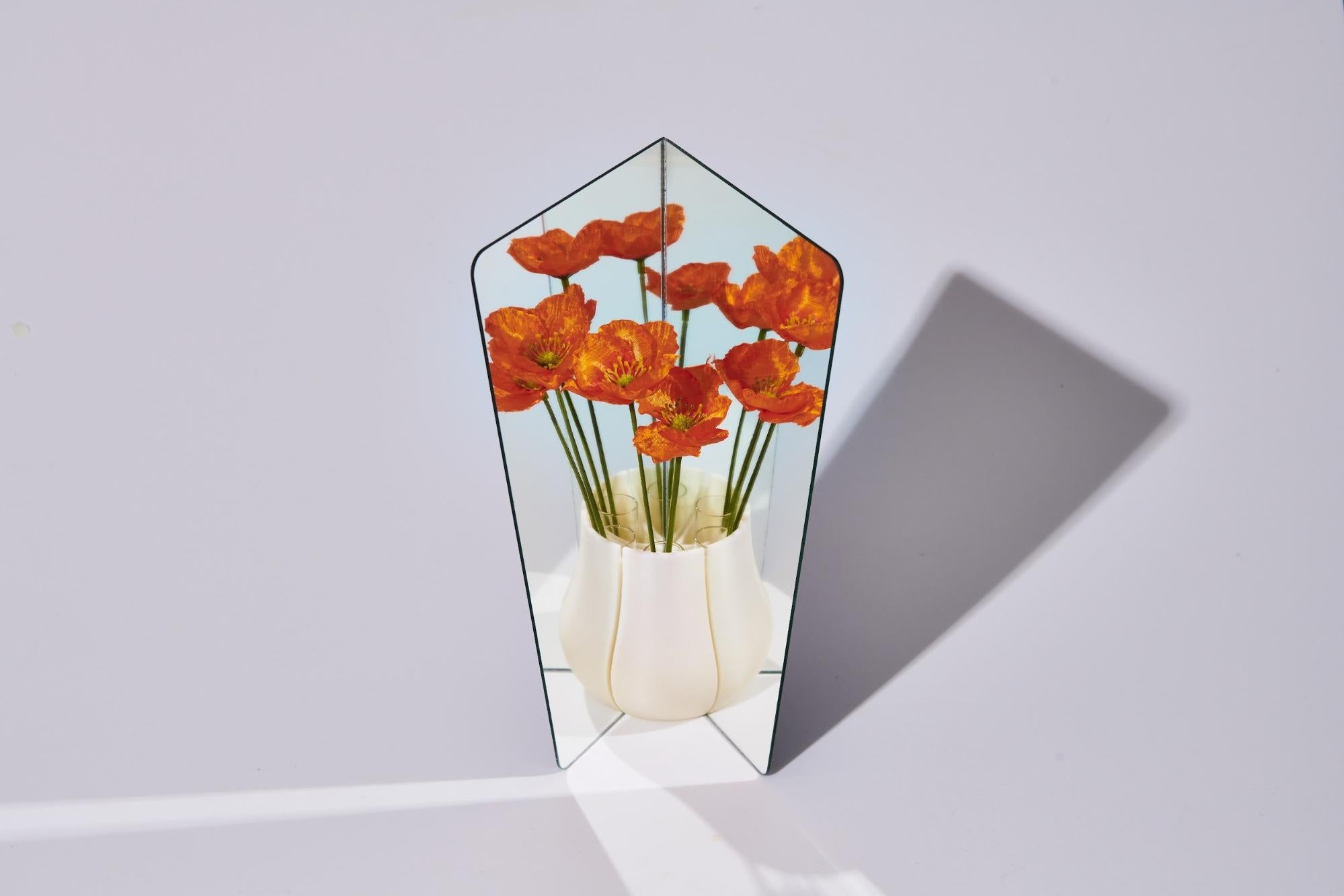 Non Flower-loss Flowerは、一輪が花束に見える花瓶です。背面に鏡を60度に置くことで、一輪が6倍の数に見え、数本でも、日常を豊かにすることができます。SDGsなど社会問題意識が高まっている時代に、花を大切に生ける方法を提案します。