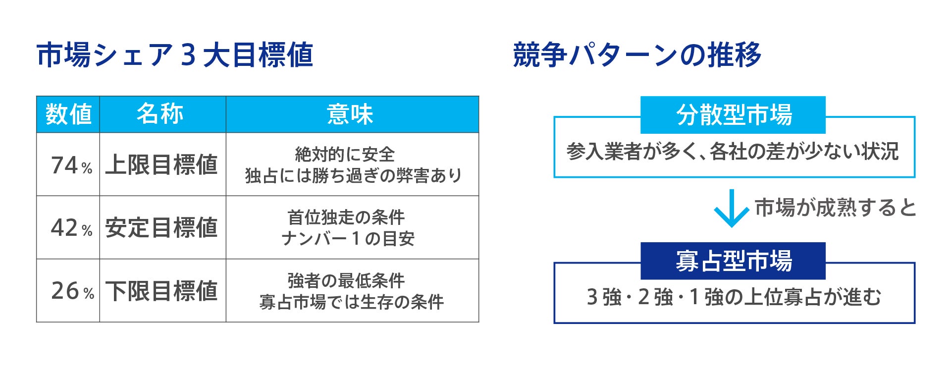 企業間競争の勝敗は市場シェアで示され、下記の市場シェア理論が代表的です。
