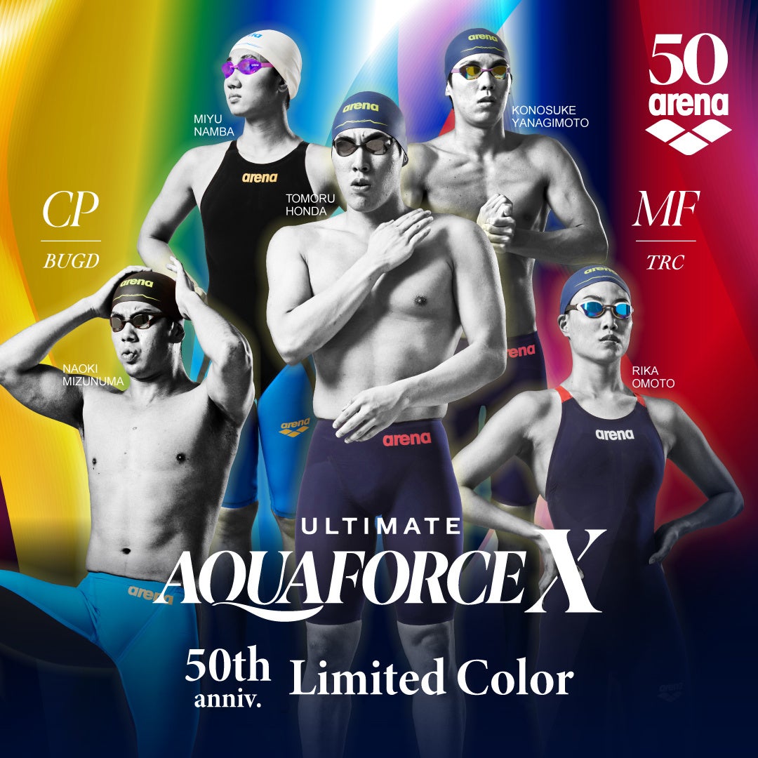 ・『アリーナ』着用選手も、日本選手権をはじめ様々な公式大会でトップモデル「ULTIMATE AQUAFORCE X」の50周年記念デザインを着用して出場します。
