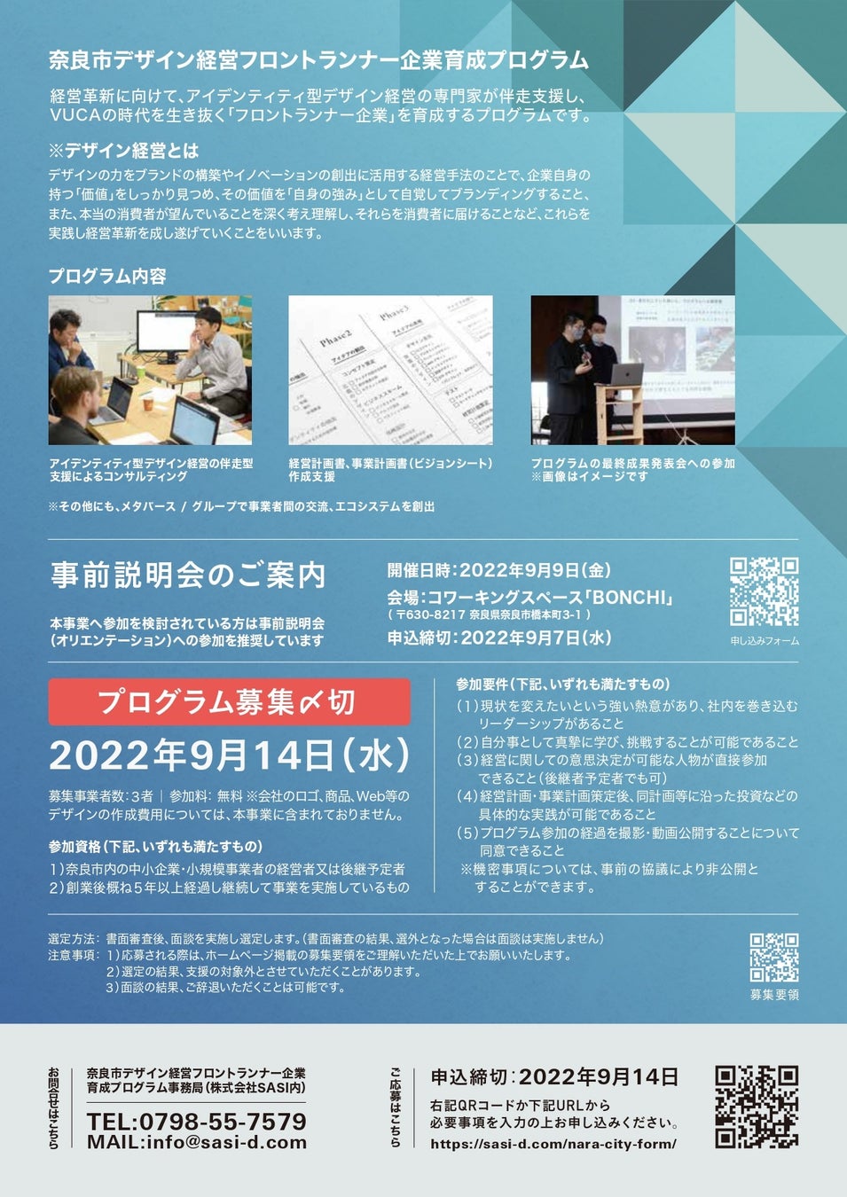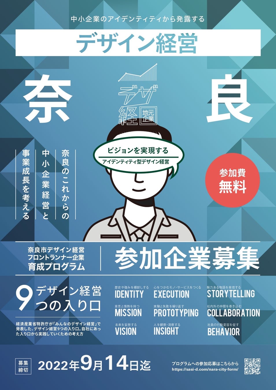 奈良市では、市内中小企業の熱意ある経営者を対象に実施する支援事業「奈良市デザイン経営フロントランナー企業育成プログラム」の参加企業を令和4年9月14日(水曜日)まで募集しています(参加無料、選考を経て、応募の中から3者選定)。