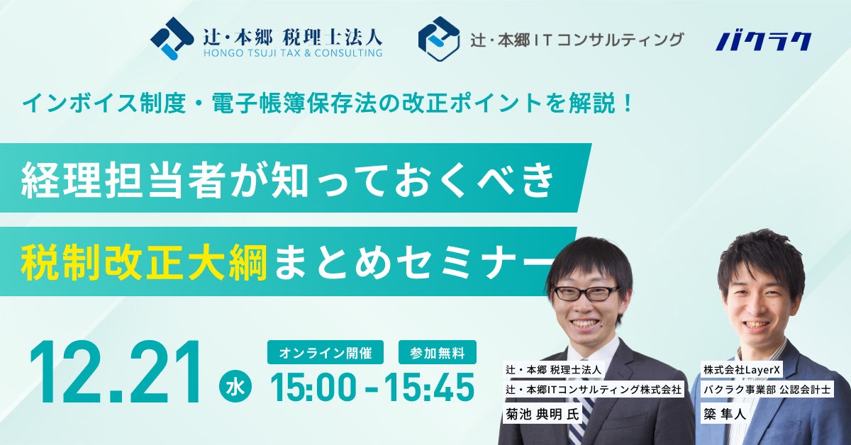 すべての経済活動のデジタル化を目指す株式会社LayerXが提供する「バクラク」は、本日発表された「令和5年度税制改正大綱」を受けて、経理担当者向けのオンラインセミナーを12/21に開催します。