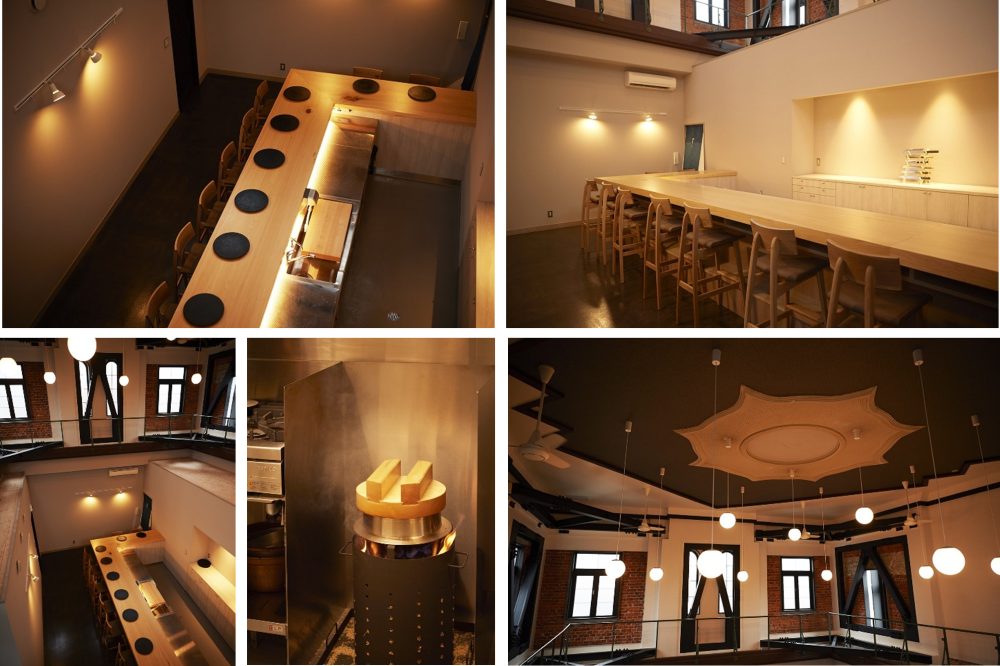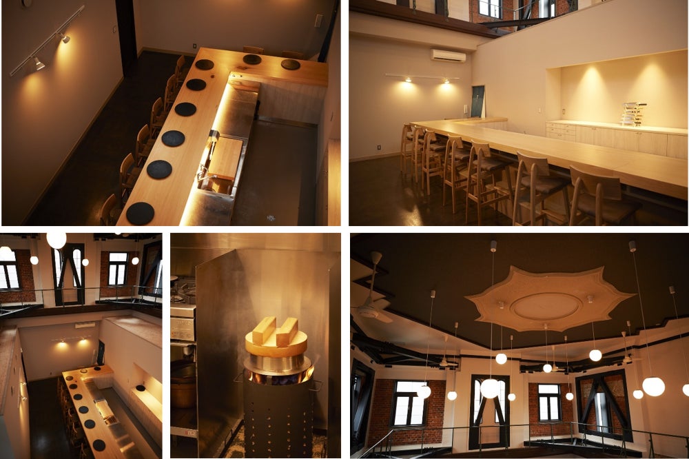 当社は、2022年11月に本物件を取得いたしましたが、建設当時の図面等は保管されておらず、構造や工法の詳細は不明であったため、構造、過去の改修等につき調査を重ねたところ、築後100年の経年劣化に加え、過去の改修による欠損箇所も確認されました。現在の耐震基準に適合させるためには多くの補強が必要とされましたが、街並みを形成する洋風の外観をそのまま保存しつつ、館内の空間や意匠も出来る限り建設当時の原型を留めるため、柱梁のRC増し打ちと鉄骨製ブレースや水平材を組み合わせて耐震補強を行う方針とし、補強後の内装はあえて仕上げ材で覆わず、レンガ壁の風合いを内装に活かすこととしました。また、特徴的な左官鏝仕上げの天井やペンダント照明を継承しつつ、内装の不燃化や照明のLED化、断熱性の優れた複層ガラス窓への更新など、今後さらに歴史的建物を利活用するための機能性向上を図りました。内装レイアウトは、施膳ろくざんさ店主の水上様と協議を重ねて厨房部分を贅沢に広くとったレイアウトとし、使い勝手にも配慮して計画いたしました。