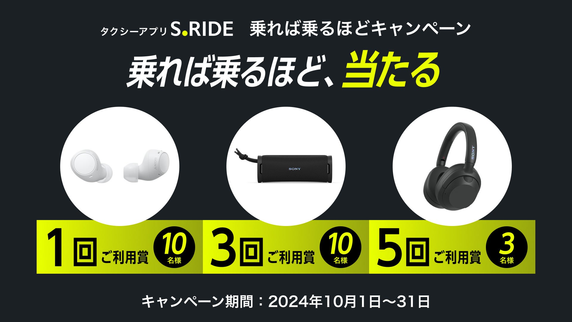 10月1日(火)より、「S.RIDE」ご利用のみなさまへの日頃の感謝の気持ちを込め、豪華ソニー製品が当たるプレゼントキャンペーンを実施します。キャンペーン期間中、「S.RIDE」アプリからの配車および予約のご利用回数に応じて、ソニー製完全ワイヤレス型ヘッドホンやワイヤレスポータブルスピーカーなどを抽選でプレゼントします。