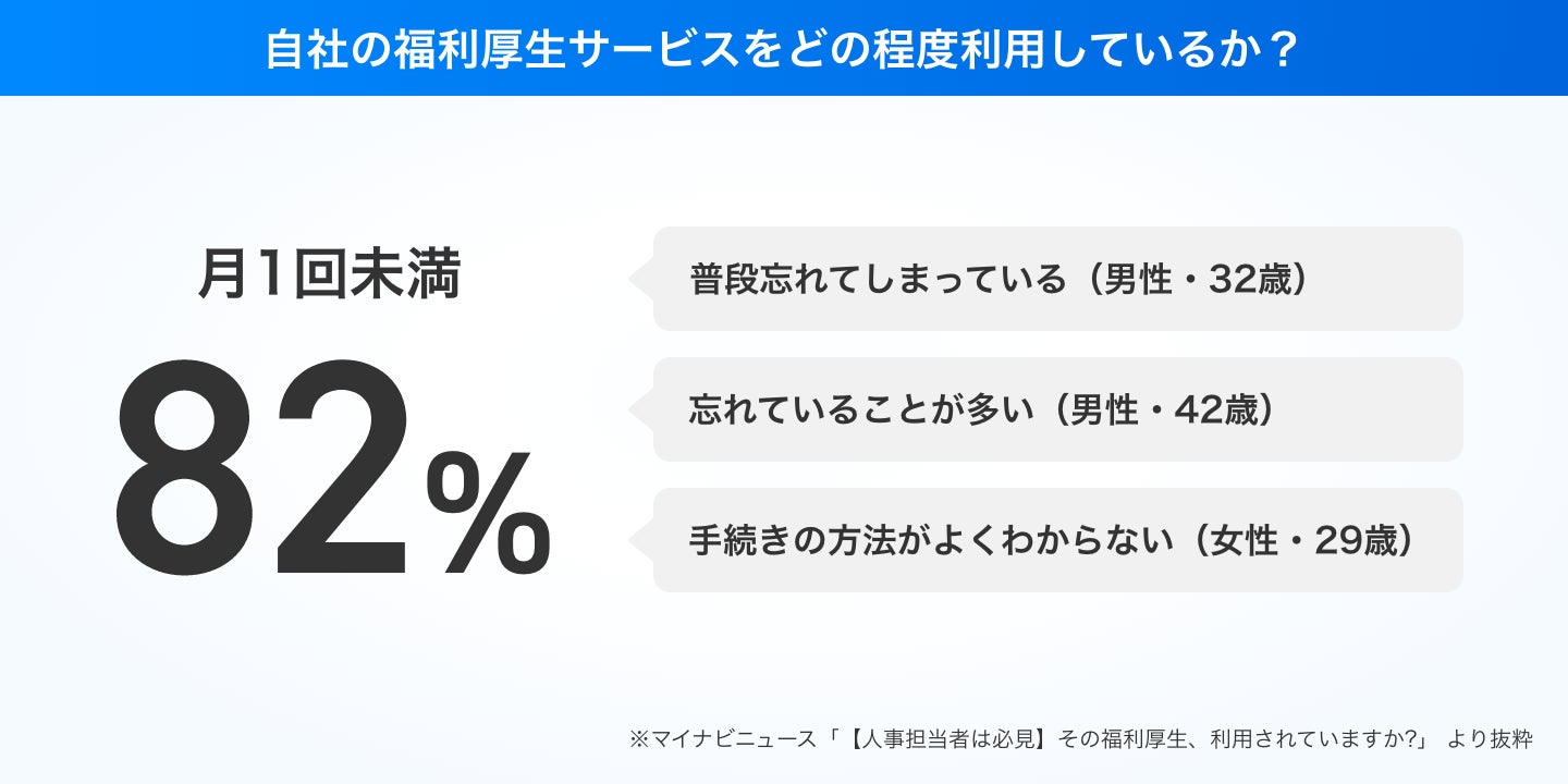 一方、外部の福利厚生代行サービスの利用頻度は極めて低く、多くの従業員に忘却されており、福利厚生の本来の役割を果たしているとは言い難い状況にあります。