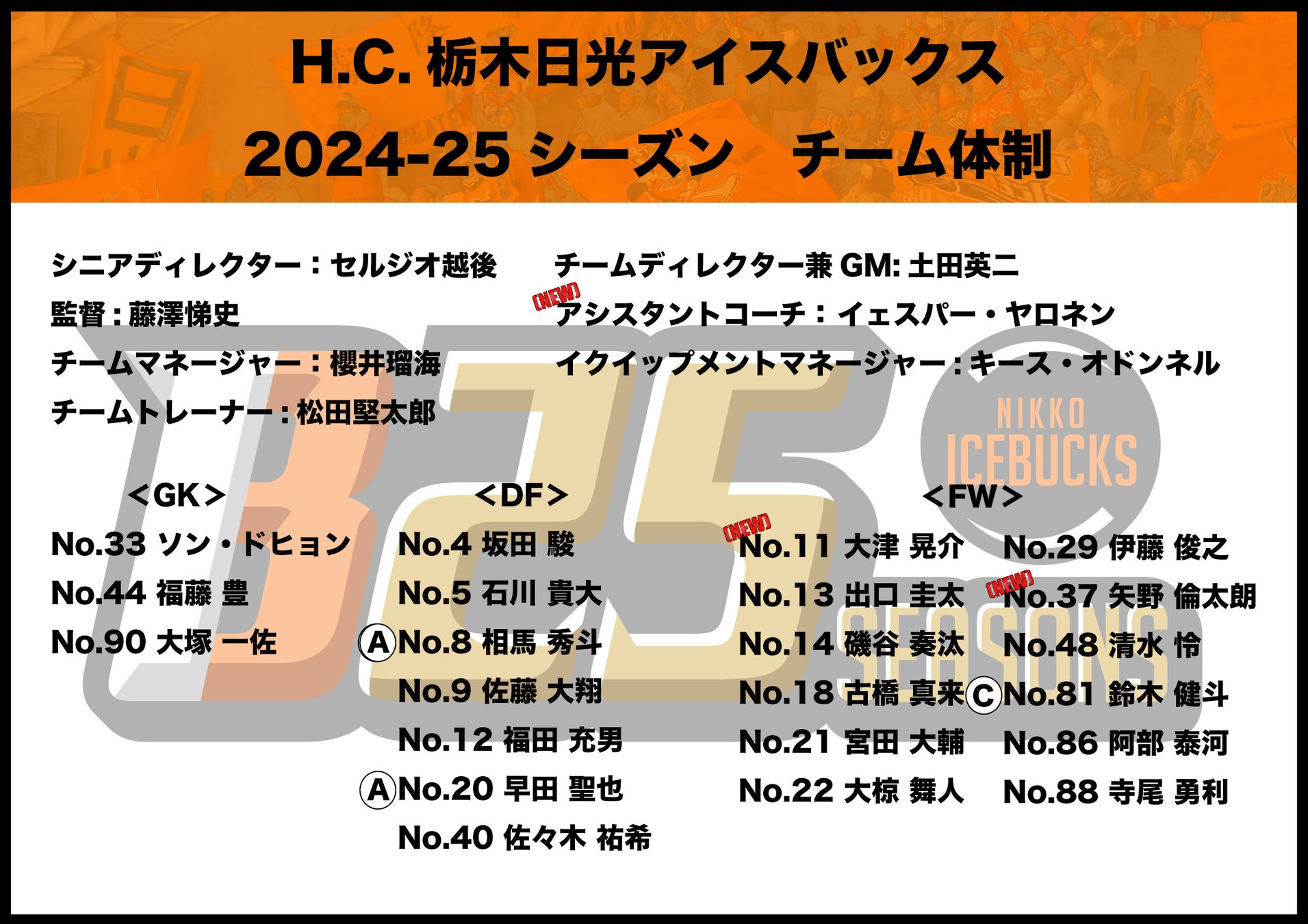 H.C.栃木日光アイスバックスは2024-2025シーズンの体制が決定しましたのでお知らせいたします。