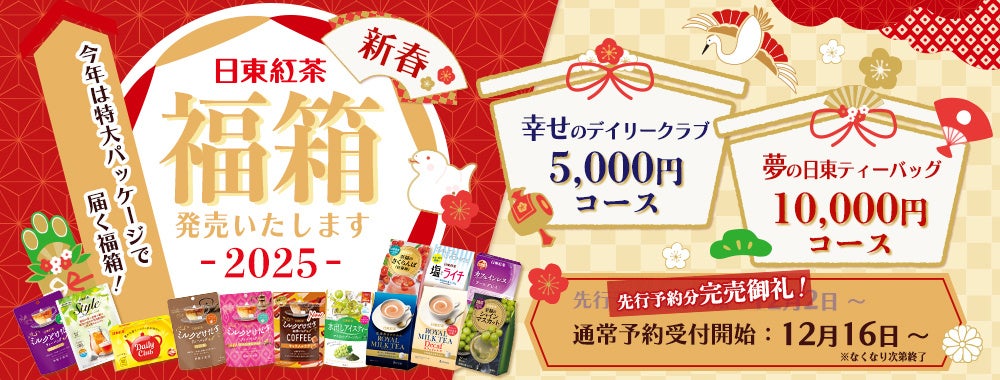 日東紅茶ブランドを展開する、三井農林株式会社(所在地:東京都港区、代表取締役社長:佐伯 光則 以下、当社)は、今年で4回目となる毎年恒例の公式オンラインショップ限定新春福箱「幸せのデイリークラブ(5,000円)コース」、「夢の日東ティーバッグ(10,000円)コース」の通常予約受付を12月16日(月)より開始いたします。