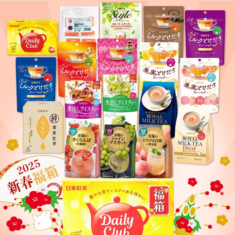 今年は「日東紅茶ファンのための福箱」をテーマに、定番商品、2024秋冬新作、オンラインショップ限定商品を詰め合わせたお得なセットをご用意いたしました。日東紅茶の代表商品である「デイリークラブ」のファンの皆様に楽しんでもらえるよう、配送箱もパッケージデザインを再現。特典もご用意し、「日東紅茶」を存分に楽しめる福箱となりました。