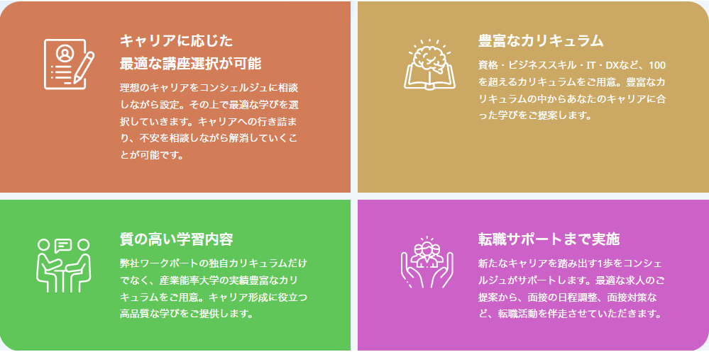 ワークポートの独自カリキュラムのほか、産業能率大学のキャリアに役立つ質の高いカリキュラムをご提供します。