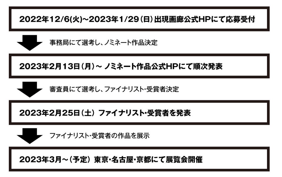 今回は、これまでのオンライン美術展への登録制度を廃止し、作品と作家情報を提出するだけでエントリー可能なクリエイターアワードを主軸とした開催となります。応募期間は、2023年1月29日まで。一次審査通過者は、2月中旬に公式HPにて発表。最終審査は、2/25の地上波特番で実施。見事受賞した作品は、3月に東京・名古屋・京都で開催予定の展覧会にて展示させて頂きます。