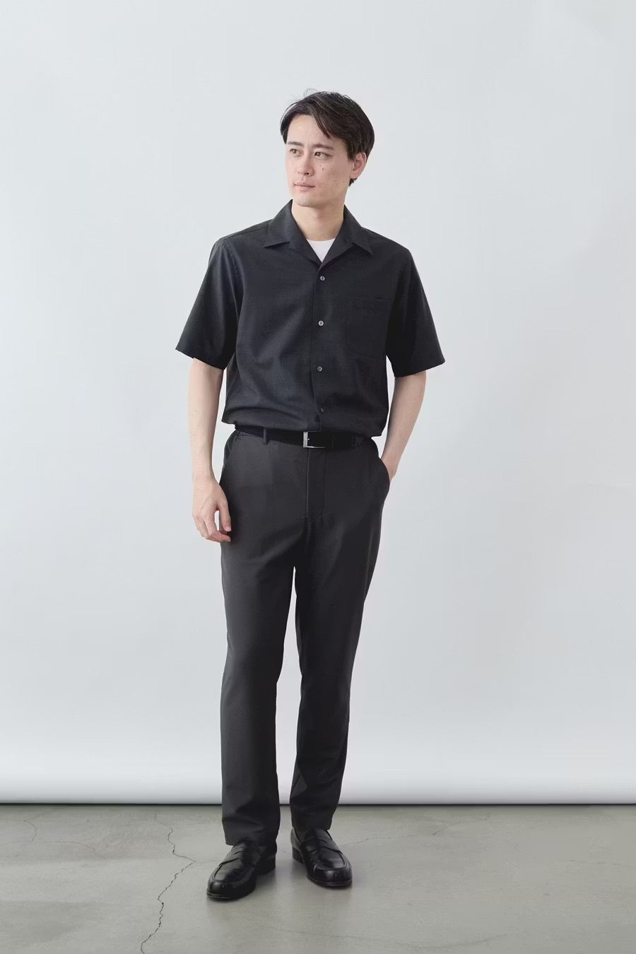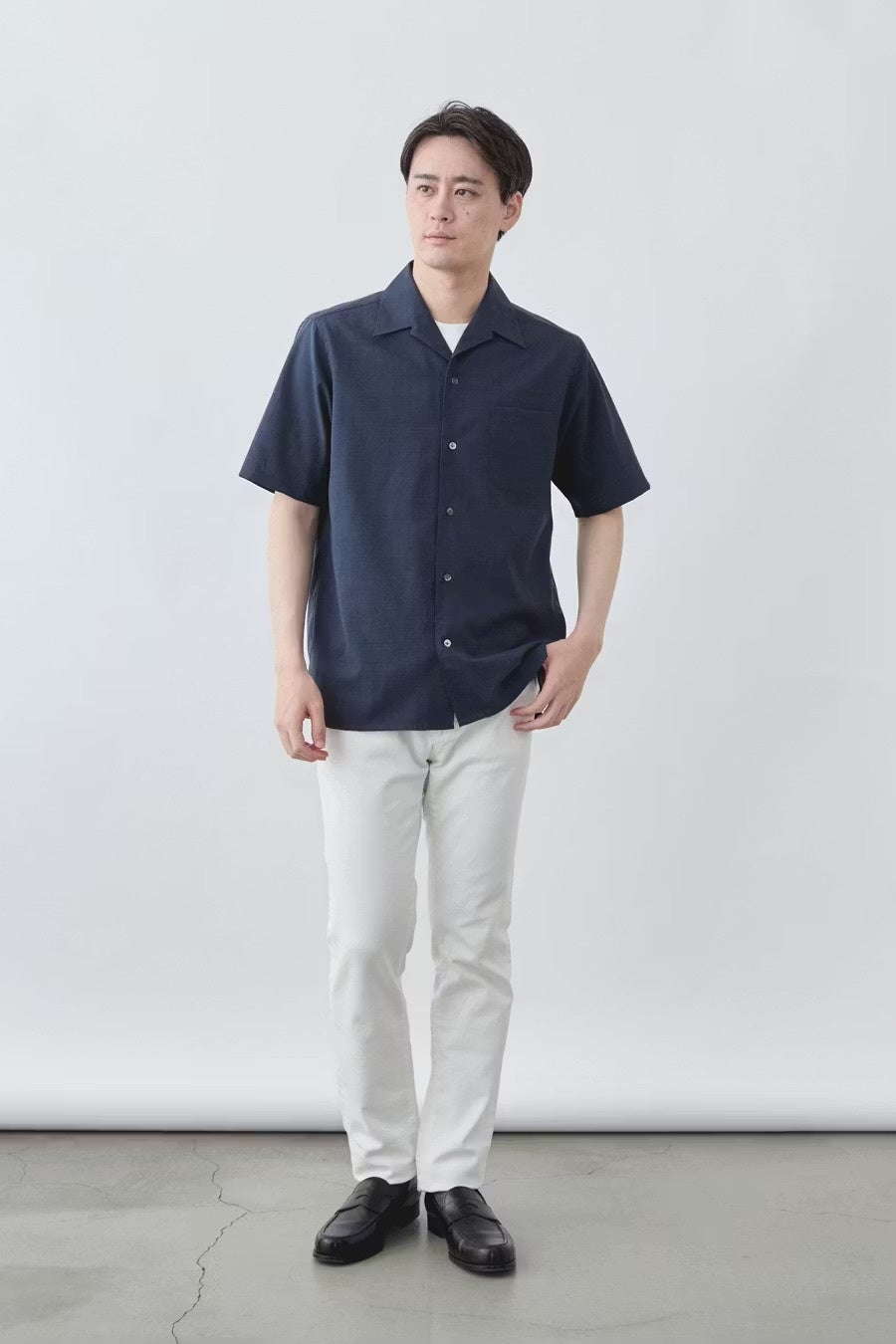 開襟シャツながらも生地の上品さが際立つため、ノージャケットでも“手抜き感ゼロ”。