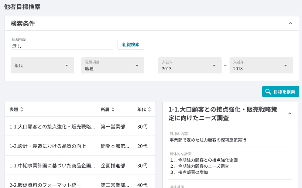社内の他者を条件で絞り込み検索でき、匿名の状態で目標内容を参照できます。自身の役割に求められるレベルの確認や、異動直後の目標設定に悩んだ時の参考情報として活用できます。