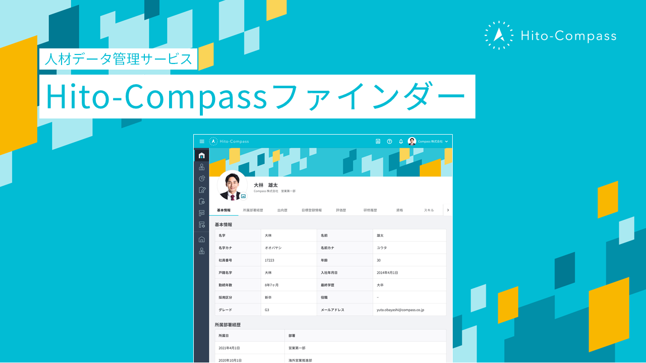 「Hito-Compassファインダー」は、グループ会社をまたぐ人財管理と検索が可能です。基本情報から評価・スキル情報まで、人事部門や部門長、所属長が必要な情報を一カ所で確認できます。