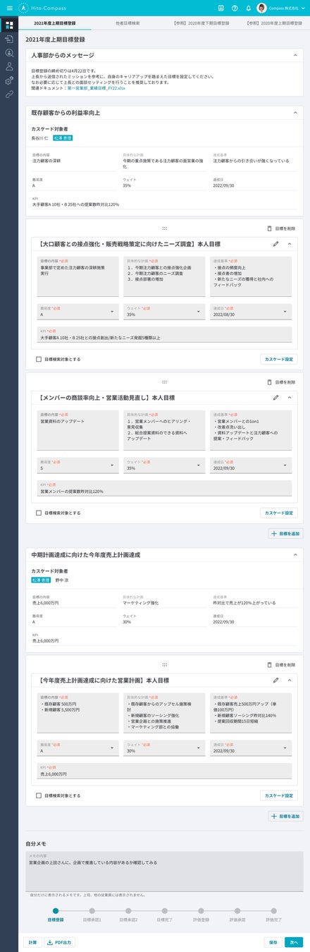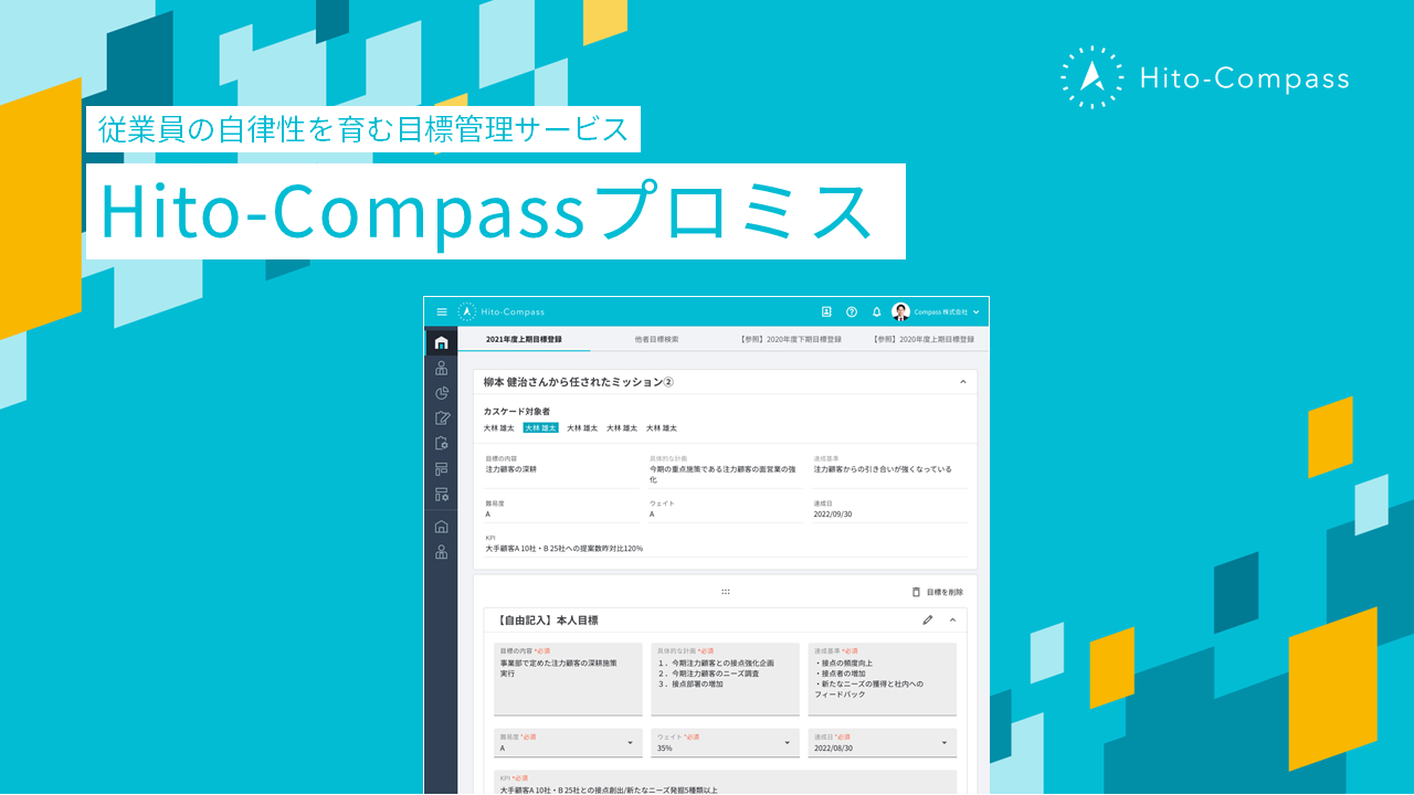 「Hito-Compassプロミス」は、組織目標の達成に向けて、目標設定と進捗管理の質を改善します。部門長や所属長が上位方針を分解し、部下のスキルや志向性に合わせた書き方で割り振ることで、従業員が納得した上で日々の業務を遂行できます。