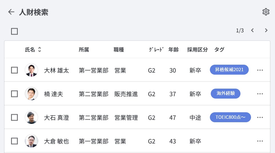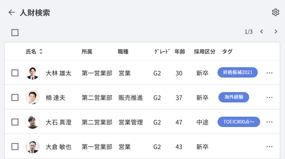 検索した結果はタグをつけてグループ分けができ、タグから人財リストを呼び出すことができます。滞留年数が多い従業員の異動検討に活用したり、昇格候補者の選抜などに活用できます。