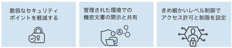 これらの機能を搭載したVDRドリブンデータ共有では、ゼロトラストの概念に基づきながらも、 「セキュリティ」と「効率化」の両立を目指していくことが、 企業DX推進では重要です。この実現に向けて、VDRドリブン製品 「DataShare3.0」でご支援します。
