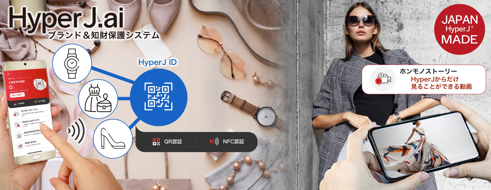 最先端のブロックチェーン技術と独自のアルゴリズムにより、模倣品をなくし「日本製」かつ「本物」であることを証明することができるソリューションが、ブロックチェーン基盤のブランド&知財保護システム「HyperJ.ai」です。「HyperJ.ai」は、データの改ざんが実質的に不可能なパブリックブロックチェーンを使用した、高セキュリティのブランド保護システムです。「HyperJ.ai」のブロックチェーンに登録されたホンモノストーリー動画は、メーカーが提供する商品とHyperJ.aiのアプリが直接連動することにより、ユーザは、安心して、メーカーが伝えたい真実のメッセージをそのまま動画で見ることができます。