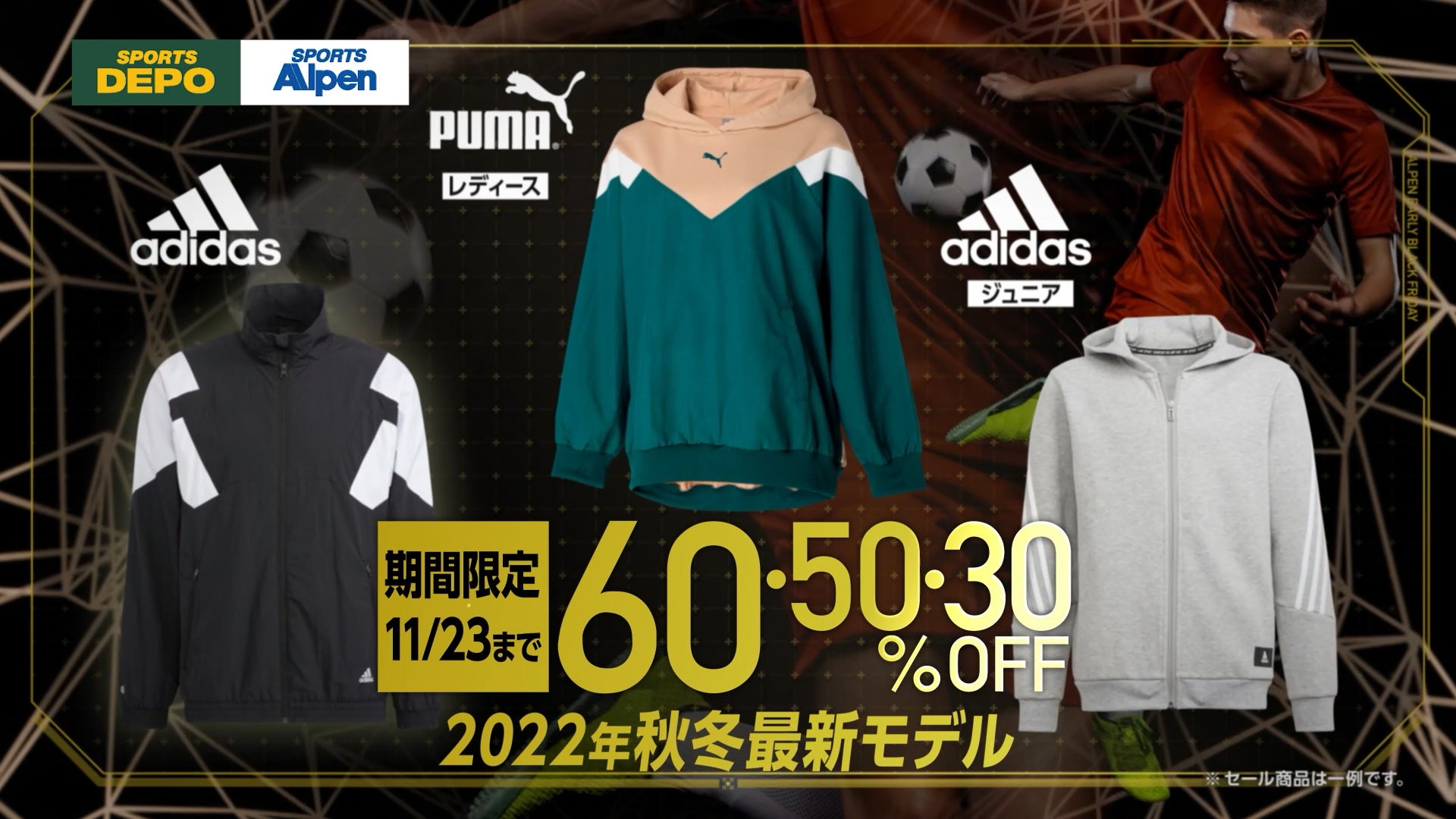 「アーリーブラックフライデーセール」では、これからの季節に嬉しい、アディダス・アンダーアーマー・プーマ・コロンビアなど人気ブランドのアウターが期間限定値下げ30%OFF。また、今欲しいスウェット等は期間限定値下げで60%OFFも登場いたします。さらに、ランニングカテゴリーでは、アディダスの対象ランニングシューズが期間限定で50%OFF。また、野球バット・サッカースパイク・バスケットシューズ・テニスをはじめ各種競技スポーツウェアなどもお買得価格で豊富な商品ラインナップをご用意いたしました。