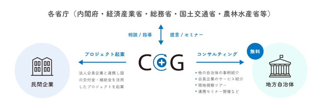 C+Gが自治体と民間企業のHUBとなり、更には内閣府・総務省・経済産業省の指導から新規プロジェクトを立ち上げることにより、地方自治体の「プロジェクト成功」に寄与していきます。