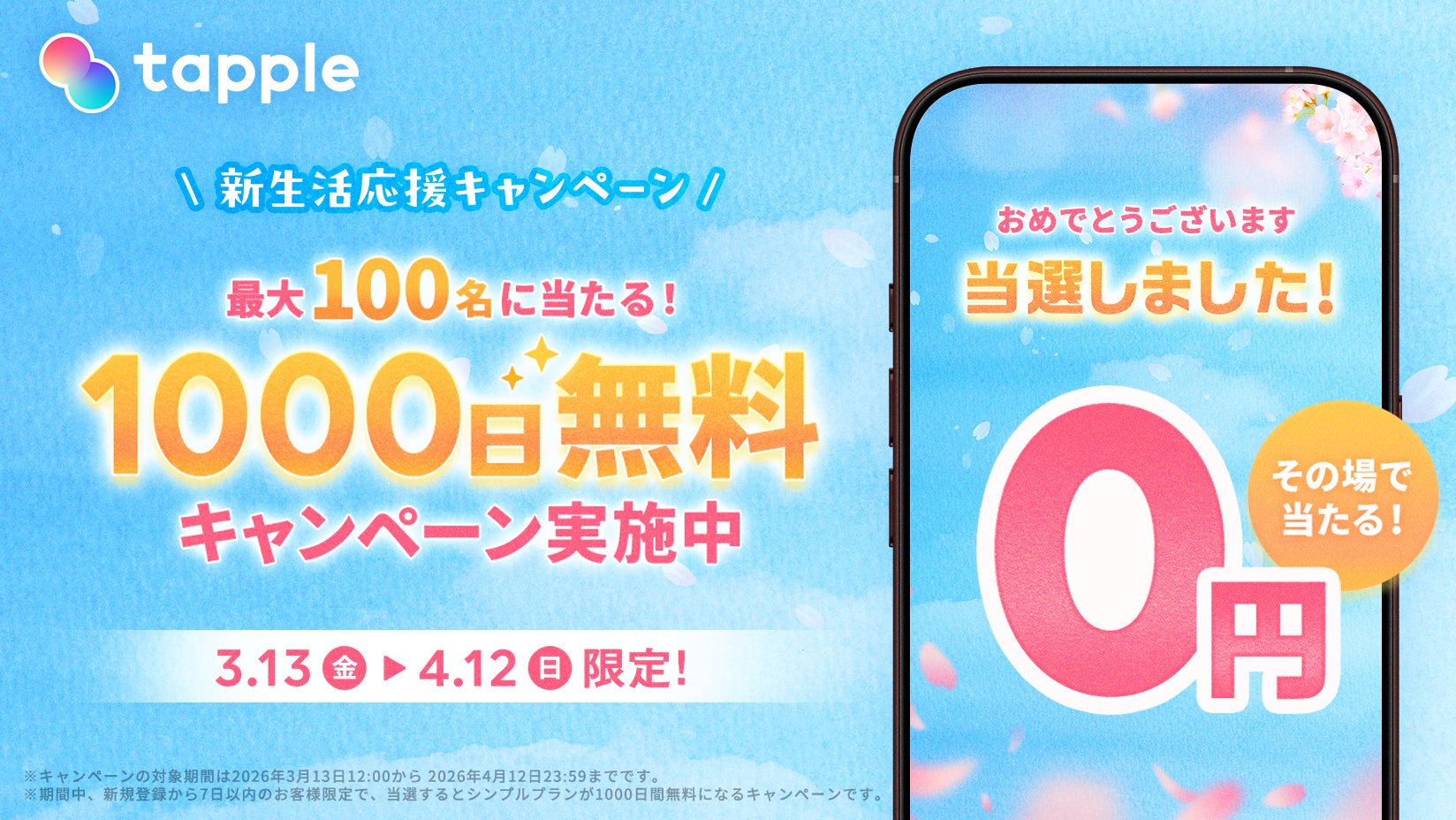 株式会社タップル(本社:東京都渋谷区、代表取締役社長:平松繁和)は運営するマッチングアプリ「タップル」において、2026年3月13日(金)より「新生活応援キャンペーン」を実施することをお知らせいたします。
