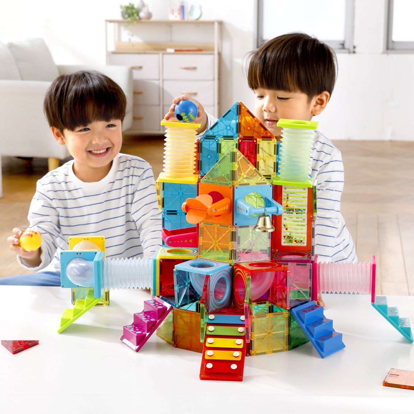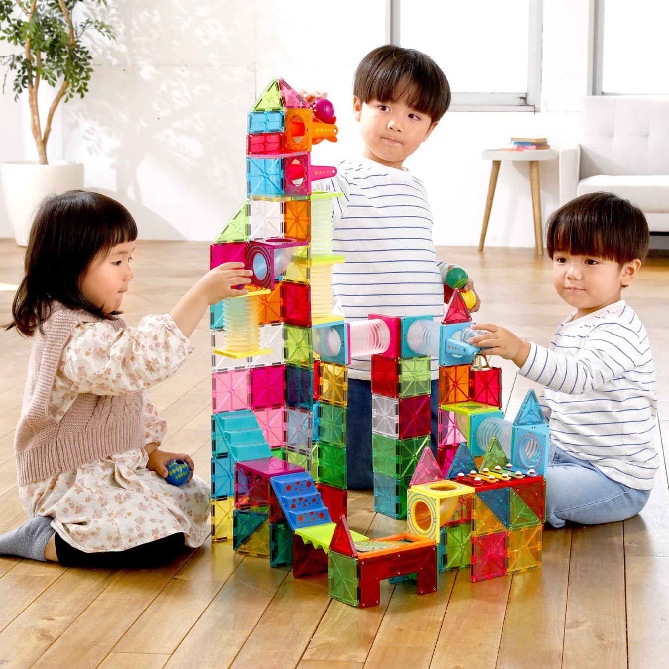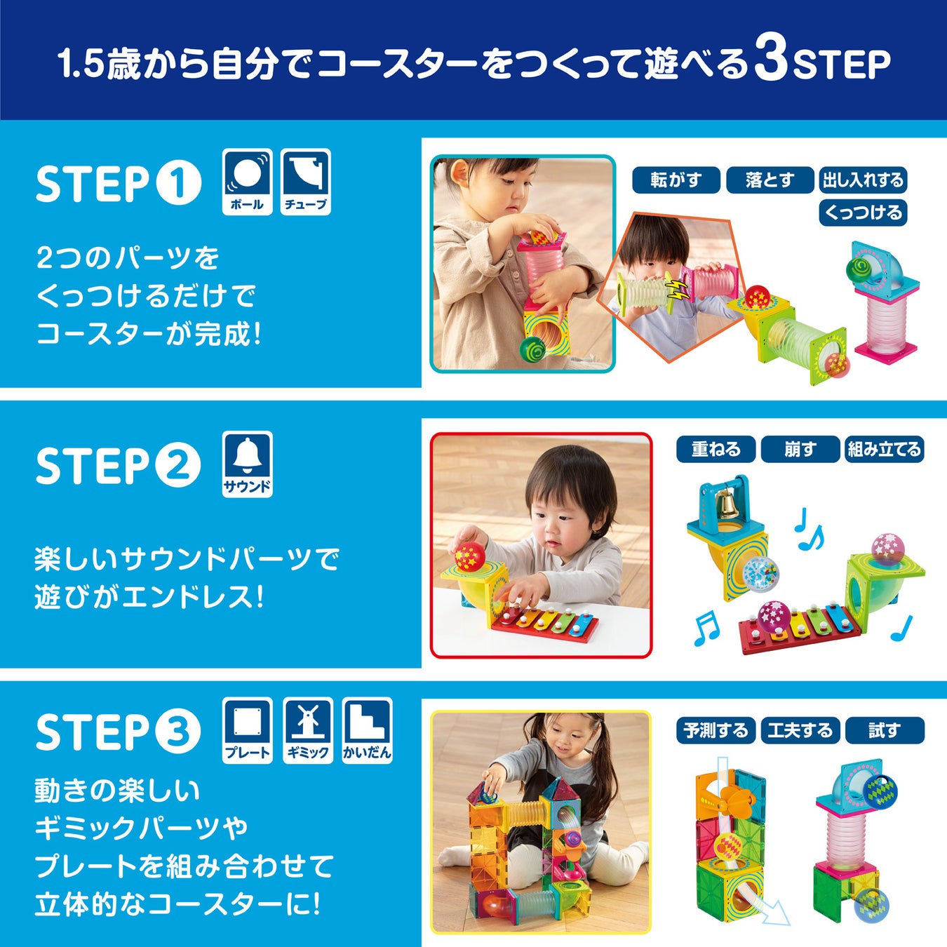 磁石の力でピタゴラスパーツをどんどんくっつけて、自分だけの大きなコースターをつくって遊ぼう!