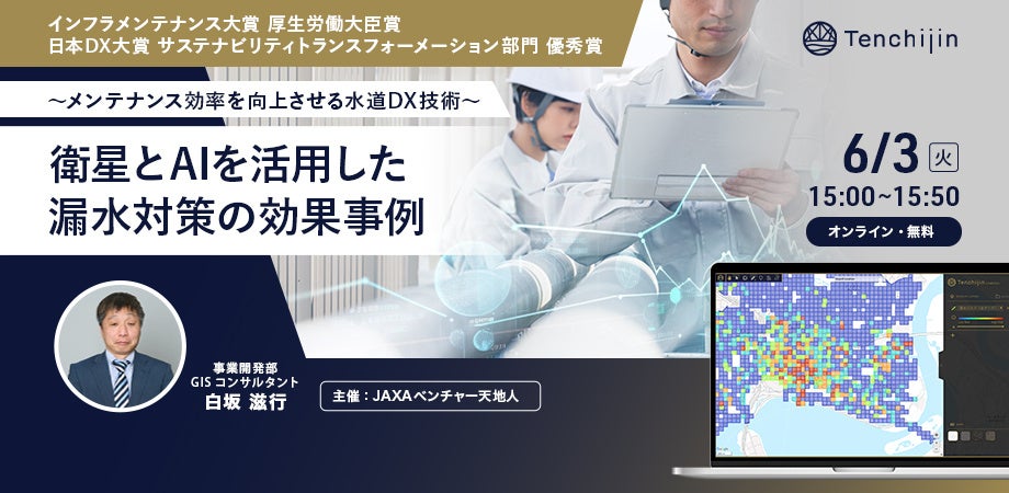 JAXA認定の宇宙ベンチャー 株式会社天地人(東京都中央区 代表取締役 櫻庭康人)は、自治体職員さま・水道事業者(公営企業)さまを対象とした水道DX戦略セミナーを開催いたします。本セミナーは、2025年6月3日にオンライン形式で開催され、無料でご参加いただけます。