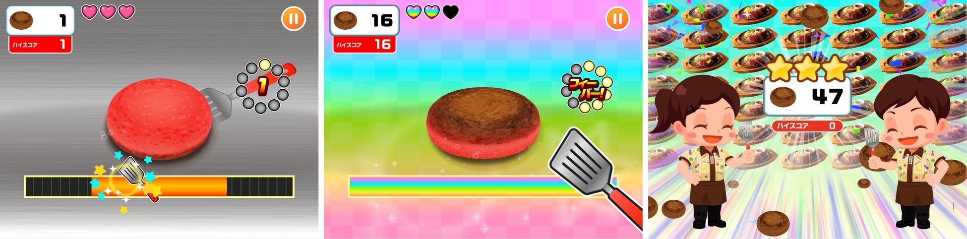 ハンバーグの調理体験を楽しむことができます。左右に自動で動くフライ返しを、ゲージ枠内でタイミングよくタップすることでハンバーグをひっくり返すことができます。ゲージの枠外でタップすると失敗となり、代わりに先輩店員さんが手伝ってくれます。連続で成功するとフィーバータイムに突入し、たくさんのハンバーグを焼くことができます。上手に焼けた枚数に応じてスコアが表示されます。