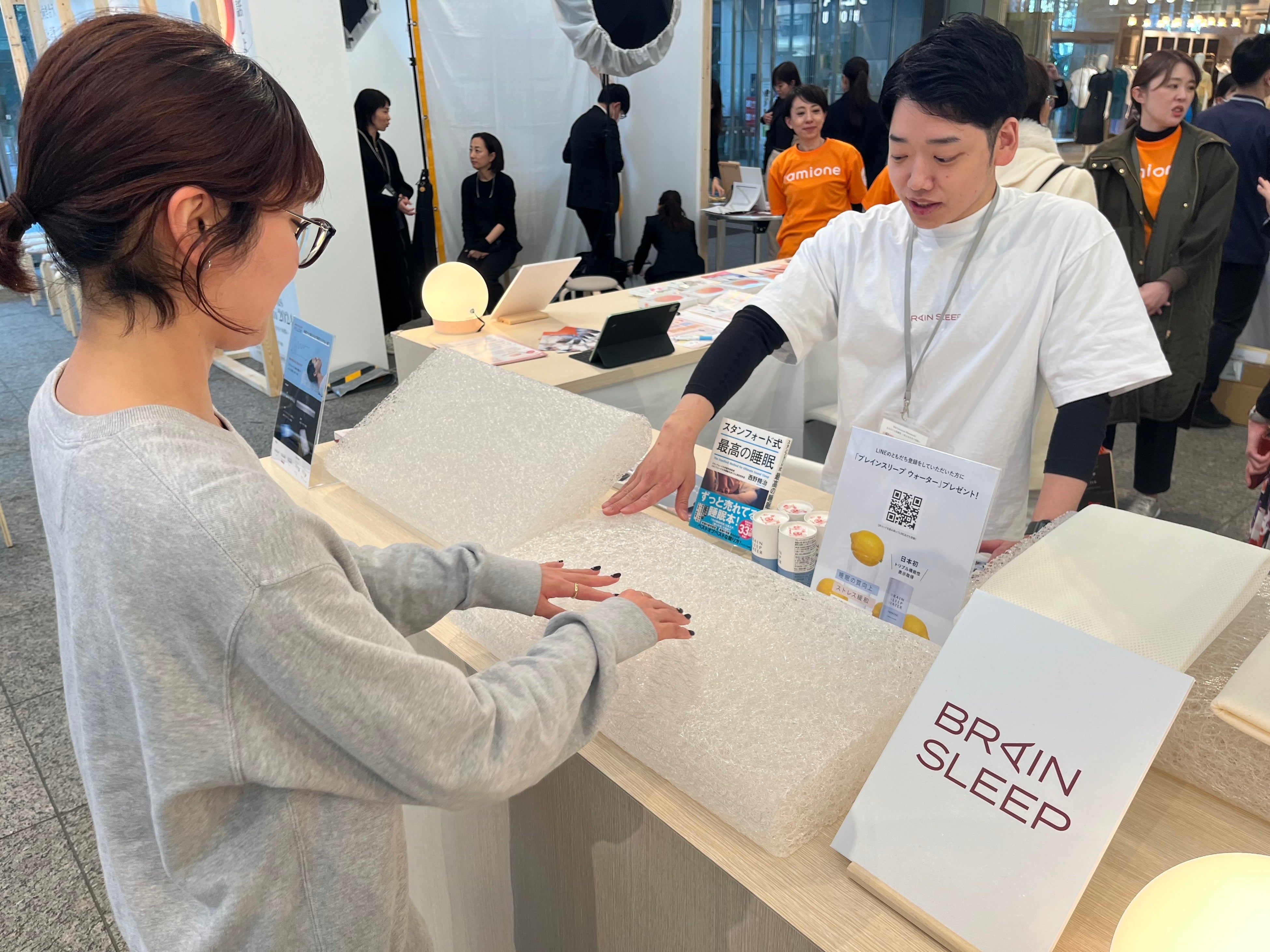 本イベント内「私と向き合うカウンター」にてブース出展も行っております。本ブースでは睡眠改善ソリューションとして脳まで眠る枕「ブレインスリープ ピロー」を展示しており、実際に触ったり、サイズ感を見ていただくことができます。また、お一人様5分、睡眠専門鍼灸マッサージ「ブレインスリープ コンディショニングスタジオ」の体験施術を受けていただけます。