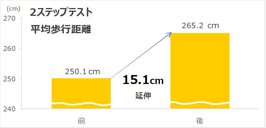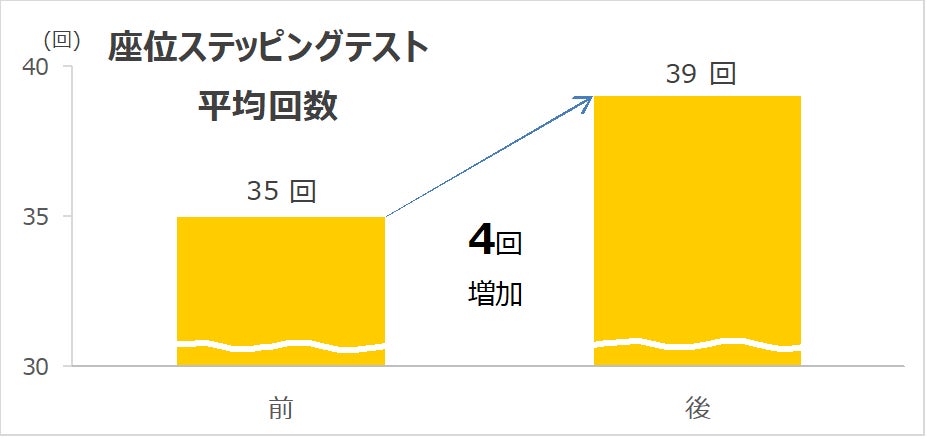 日常的にバランスボールに座りエクササイズを実践することで、下肢筋力、バランス能力、敏捷性の向上が確認されました。また、転倒リスクの低減にも有意な成果が得られました。以下の図は片足立ち上がりテスト、座位ステッピングテスト、2ステップテストにおいて有意差が認められた図です。