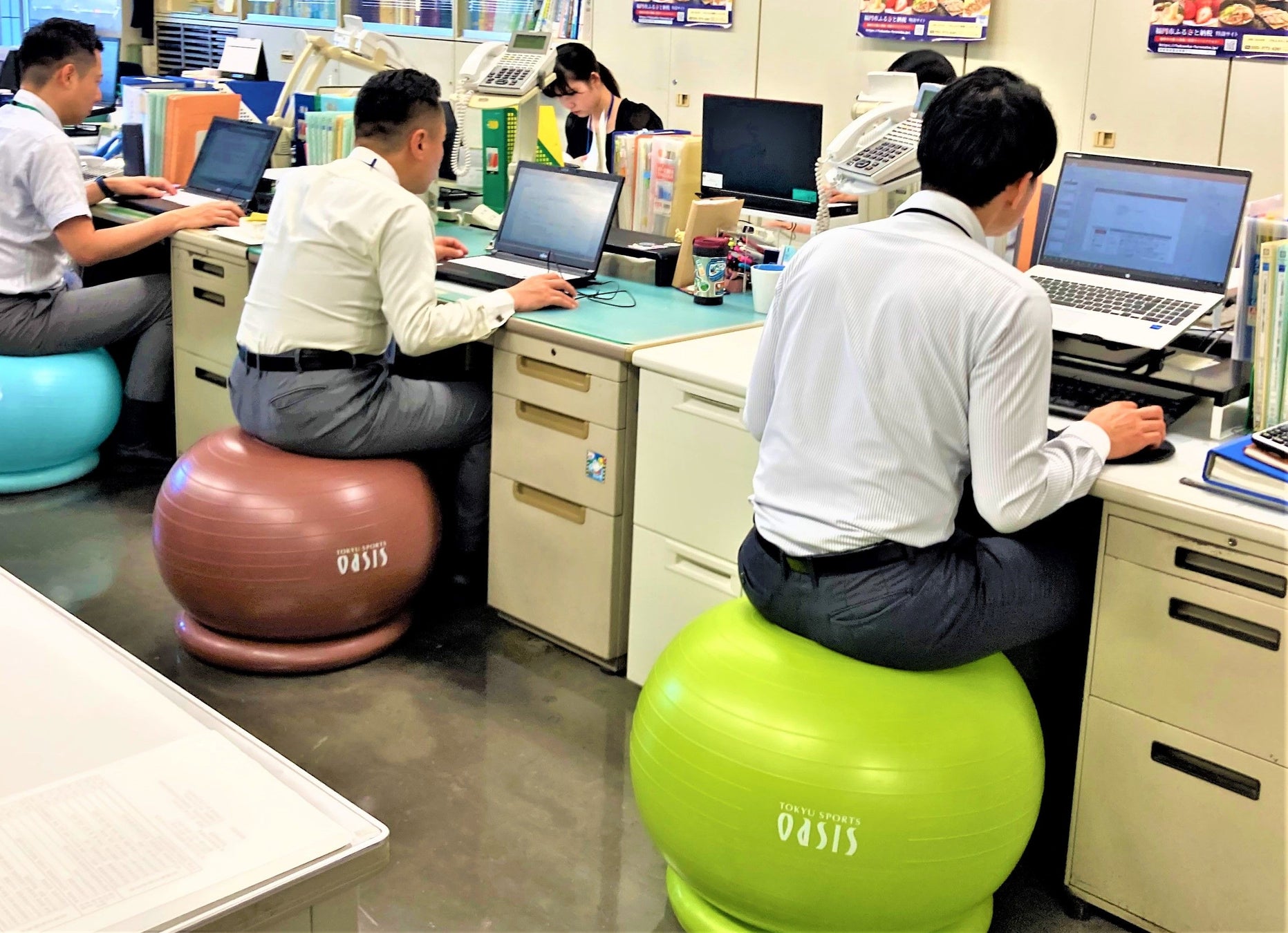 福岡市職員が3か月間オアシスのバランスボールを事務椅子代わりに業務中に使用し、休憩時間等にルネサンスが提供したバランスボールエクササイズを約3か月間実施。