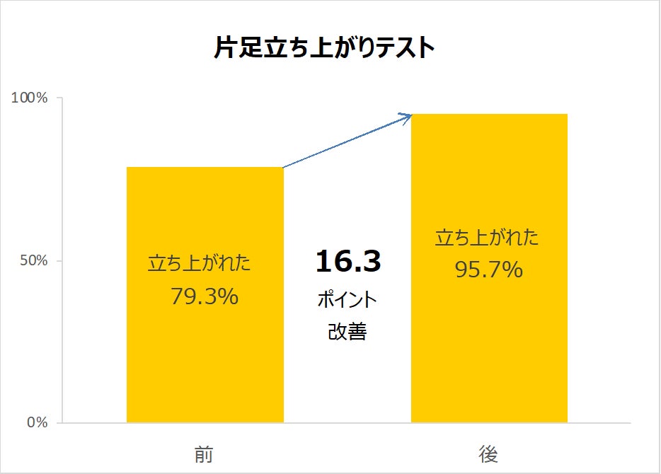 実験前に「1か月間でつまずいた」と回答した方の割合が60.9%であったのに対し、実験後には32.6%にまで減少。さらに、「1か月間で転倒した」方は0名という結果が得られています。また、腰痛・肩こり・膝痛に関しても、痛みの改善が見られる傾向が確認されました。参加者より「姿勢がよくなった」「腰痛などの気になる痛みが軽減した」などの声も上がっています。