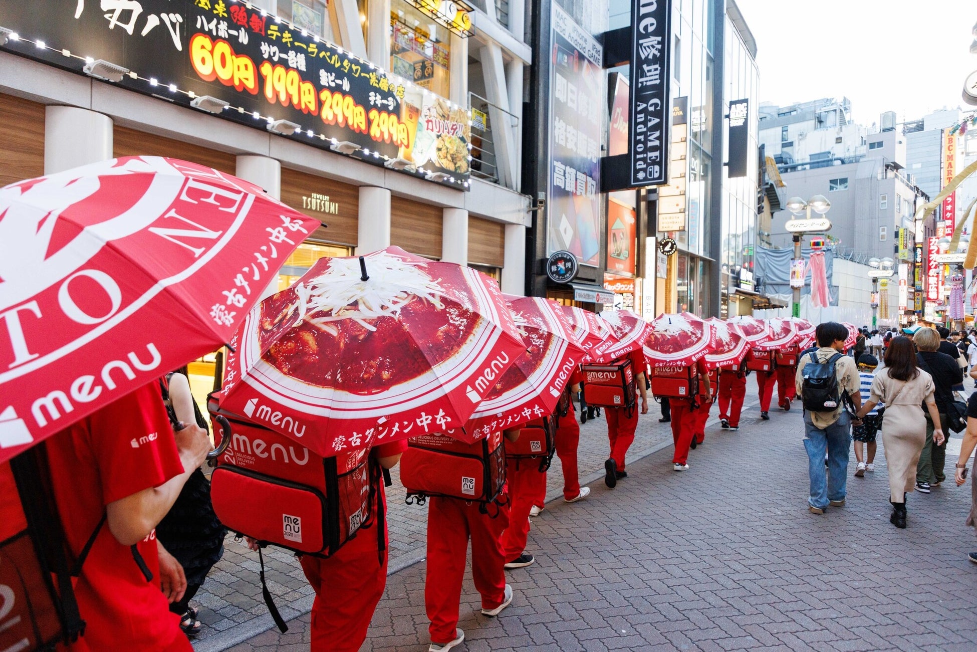 menuは2023年8月3日、「蒙古タンメン中本」のデリバリー提供開始を記念した“ゲリラプロモーション”を実施。真夏の渋谷を舞台に、menuと「蒙古タンメン中本」のコラボグッズ「蒙古タンメン中本傘」を差した23人の“中本軍団”が集結し、街を練り歩きながらチラシを配り、“辛うま”の魅力を熱くアピールしました。
