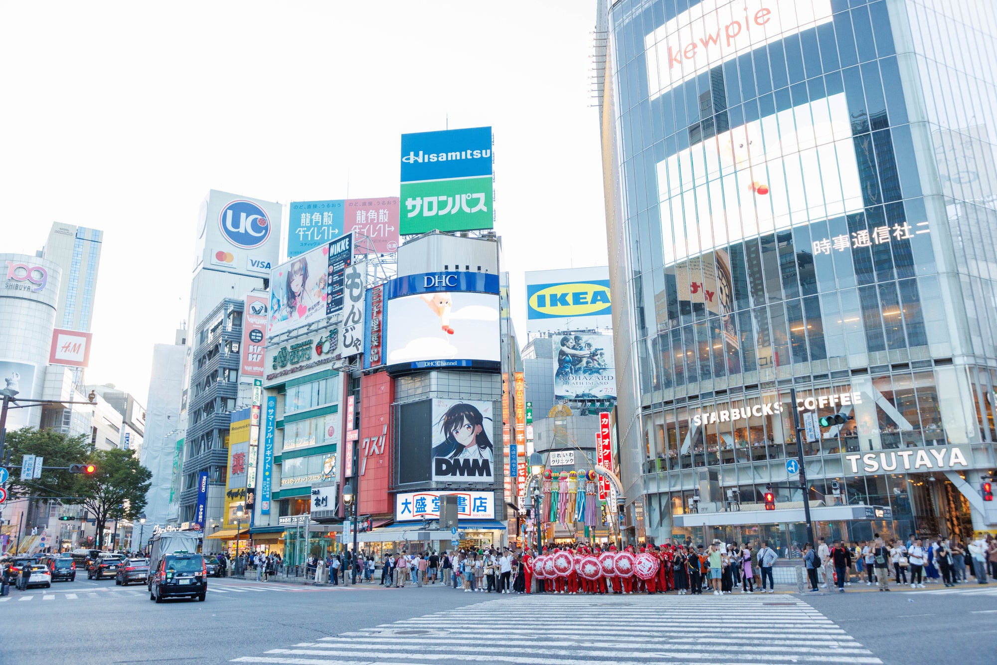 渋谷スクランブル交差点~センター街:人が集まる渋谷の街で、「蒙古タンメン中本傘」が強烈な存在感を放ちます。スマートフォンを構えて写真を撮る方や、「蒙古タンメンだ!」「北極だ!」など、通行人の目を惹きつけました。