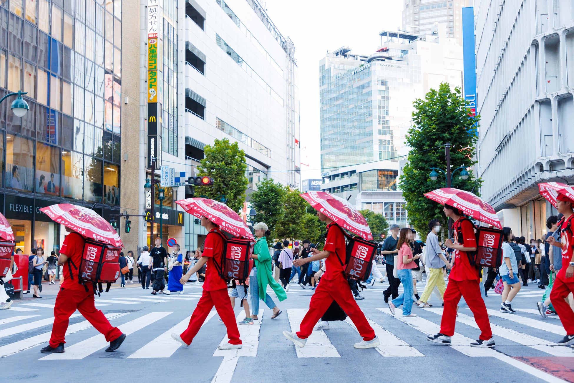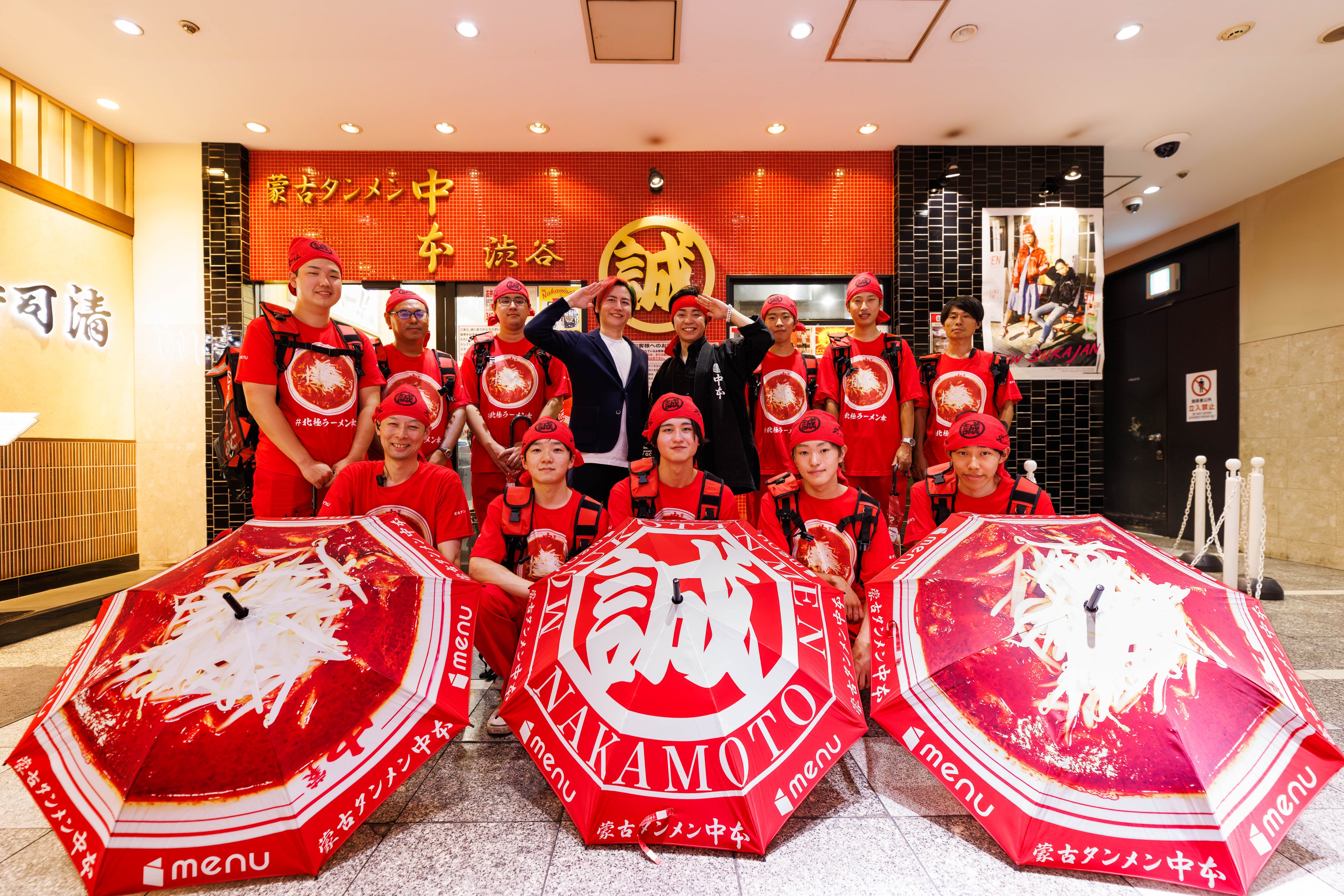 今回のゲリラプロモーションでは、menuのデリバリーバッグを背負い、「北極ラーメン」がプリントされた真っ赤なTシャツに身を包んで「蒙古タンメン中本傘」を差す“中本軍団”が渋谷の街に初登場。SNSでも話題になるなど、人があふれる渋谷で大きな注目を浴びました。中本軍団はスクランブル交差点、センター街、蒙古タンメン中本 渋谷店までを練り歩き、街ゆく人々に強烈なインパクトを残しました。